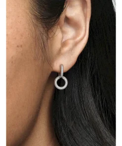 Two’s better than one with the Sparkling Double Hoop Earrings. Hand-finished in sterling silver, these hoops feature two same-size linked circles with rows of bead-set clear cubic zirconia pavé. Micro-beading, embossed hearts and the Pandora logo add even more intricate details to these dangling hoop earrings, which swing from the bottom half, giving them a lovely movement. Put these on for a night out or to add a polished touch to your daytime look.