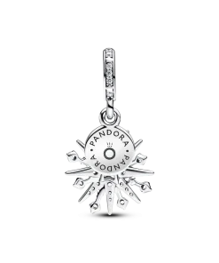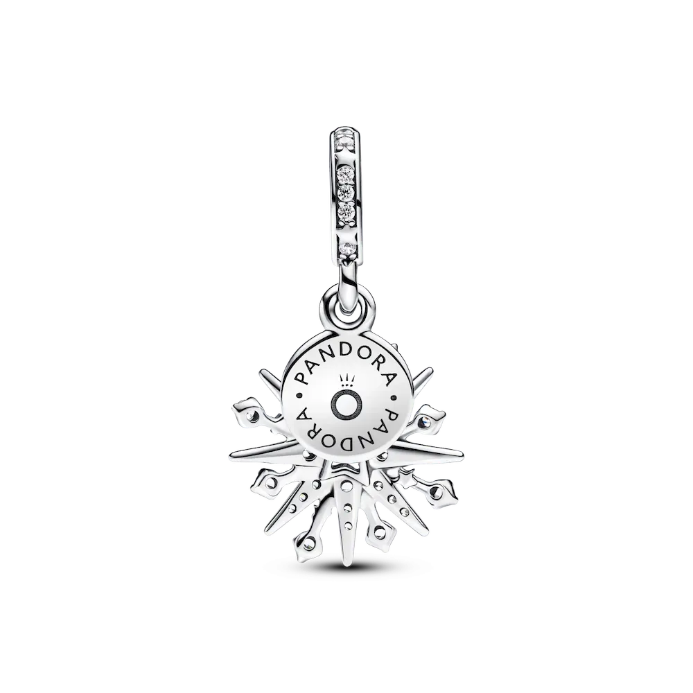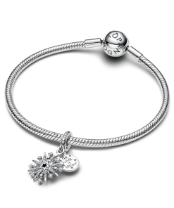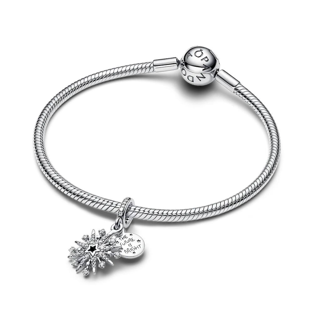 Add our celebration-worthy Sparkling Firework Double Dangle Charm to your collection for a pop of star-lit fun. Crafted in sterling silver, one dangle features a cut-out star with shining stars, metal points and sparkling stones representing firework sparks radiating from the centre. The second dangle features the message