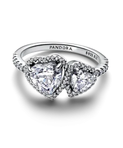 An eye-catching statement of love. This ring showcases two heart-cut clear cubic zirconia stones, connected by a halo of shimmering pavé. Crafted in sterling silver, the top half of the band is adorned with more sparkling stones, creating a radiant effect. Pair it with other sterling silver rings for a love-filled stack, or let it shine as a standalone statement. Inspired by the love that connects us, the two hearts symbolize harmony and unwavering support between two souls.