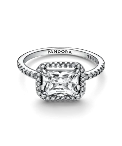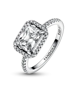 Make a stand-out statement with the Sparkling Halo Ring Set. This sterling silver ring set includes a stunning vintage-inspired ring embellished with a halo of sparkling cubic zirconia stones and showcasing a large rectangular radiant-cut stone as its centerpiece. The central stone is slightly raised so the ring can sit flush against the bold but simple eternity ring, with its full circle of cubic zirconia stones. Wear each ring on its own or style them together for an effortless, contemporary look with high-impact sparkle.