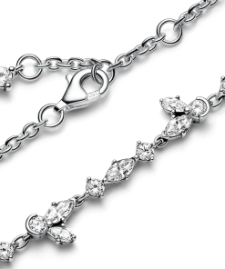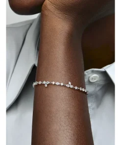 Take inspiration from the beautiful shapes of nature with the Sparkling Herbarium Cluster Chain Bracelet. Inspired by pressed flowers and leaves, this hand-finished sterling silver bracelet is set with cubic zirconia stones in alternating round and marquise shapes along half the chain, with two clusters of round, marquise and pear-shaped stones creating nature-inspired shapes, attached by jump rings so they move naturally with the chain. The bracelet is adjustable to three sizes. Elevate your looks with this elegant reminder of the beauty of nature.
