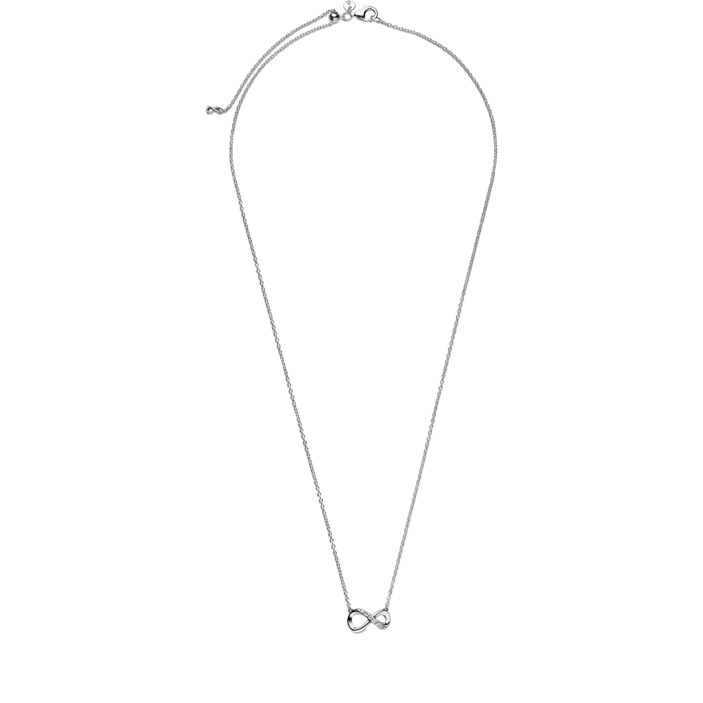 Wear the ultimate symbol of eternal love, the infinity symbol close to your heart with this necklace. A curved design means the infinity symbol rises in the center, creating an eye-catching three-dimensional look while the slider clasp of the collier necklace allows you to adjust the length to suit your style. Crafted in sterling silver and featuring seven bead-set round brilliant-cut clear cubic zirconia, this is a subtle design and delicate form with unique deeper detailing.