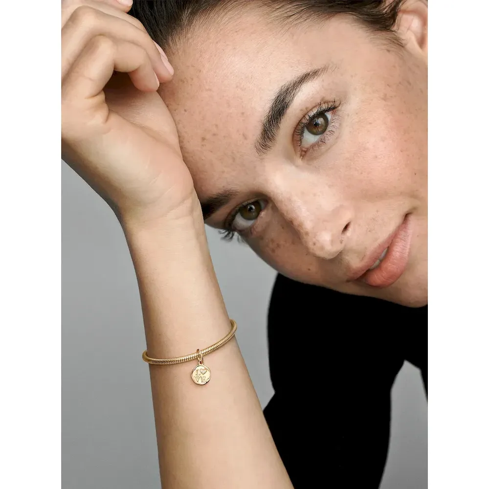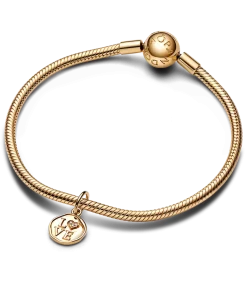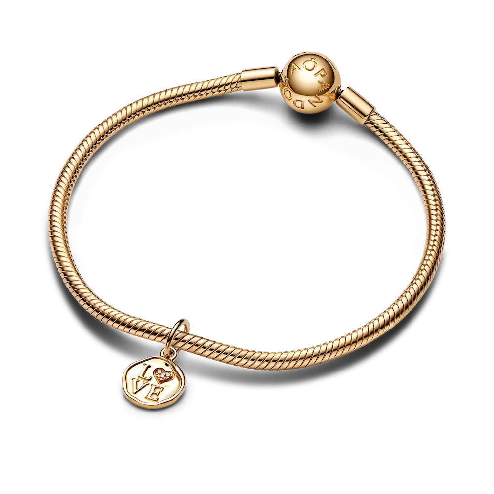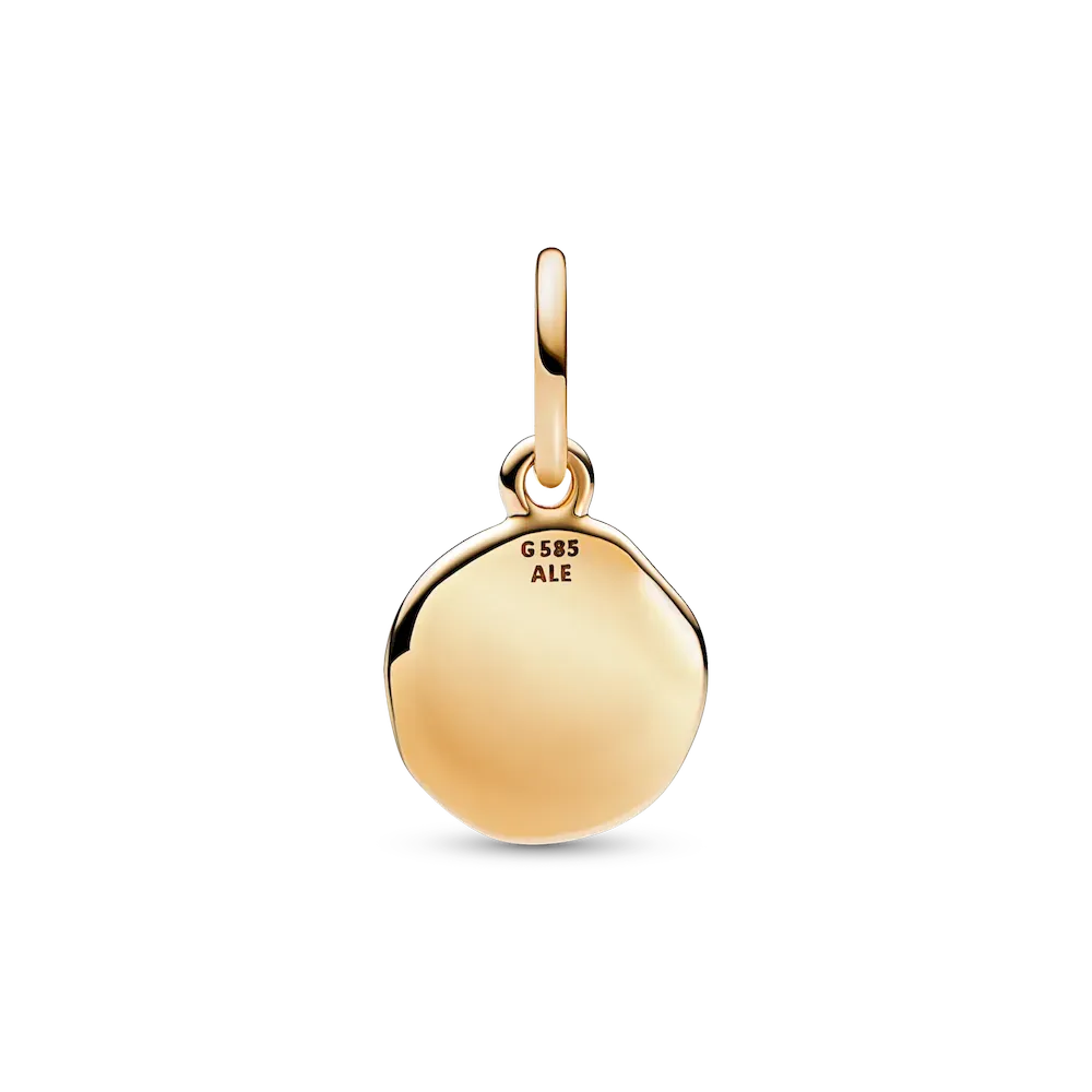 A golden gift for the one who’s left their stamp on your heart. The Sparkling Love Stamp Dangle Charm is crafted in 14k solid gold and features an organically shaped round disc with slightly raised edges, resembling an old-fashioned wax seal on a letter. At the center are raised letters spelling