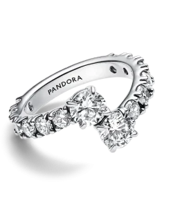 Sparkle with style with the Sterling Silver Sparkling Overlapping Band Ring from Pandora’s Timeless collection. Channeling cool tones, this ring showcases a row of meticulously set clear cubic zirconia stones. The band subtly overlaps at the centre, with larger stones on each end, forming an eye-catching centerpiece. Inspired by Pandora’s Sparkling Row Eternity Rings, this piece offers a bold, dimensional look. Elevate your style with this exquisite sterling silver ring.