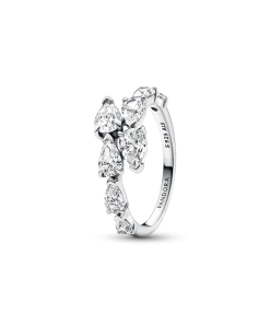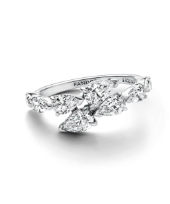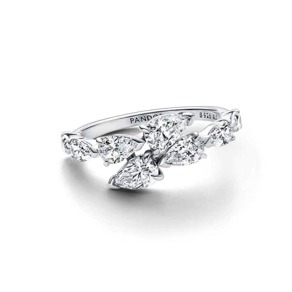 Wrap yourself in sparkling style with the Sparkling Overlapping Band Ring. This sterling silver ring features four pear-shaped stones on each overlapping end. V-shaped prongs at the tip of each stone emphasise the pear shape, while claw-shaped prongs at the wide end of the stone keep it secure. Sleek, stylish and striking, this asymmetrical ring is a fresh twist on a classic design and makes a stunning addition to any look.