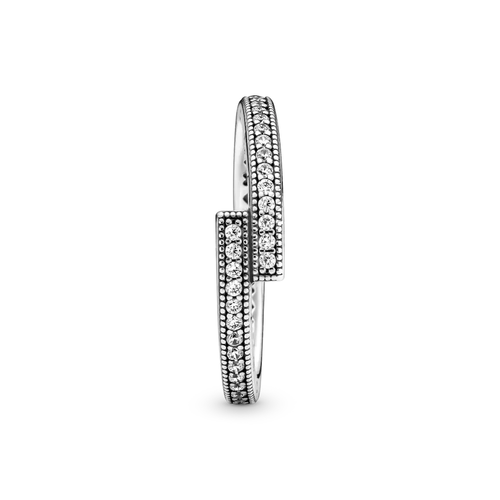 Opt for modern minimalism with the Sparkling Overlapping Ring. This Sterling Silver ring features an asymmetrical design where the square ends of the band slightly overlap to create 90-degree angles. The outer band features clear cubic zirconia pavé framed by micro-beading, the sides have the Pandora logo and the inner shank has cut-out hearts. There are two Pandora Crown O monograms at the end of each profile. Subtly stunning on its own or show-stopping when multiple are stacked together, this ring makes a clean, chic statement.