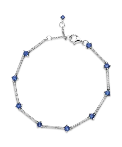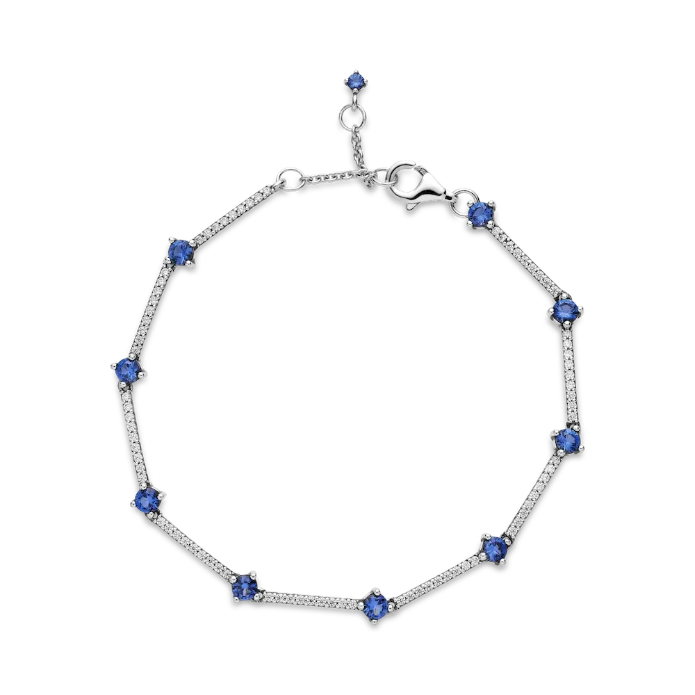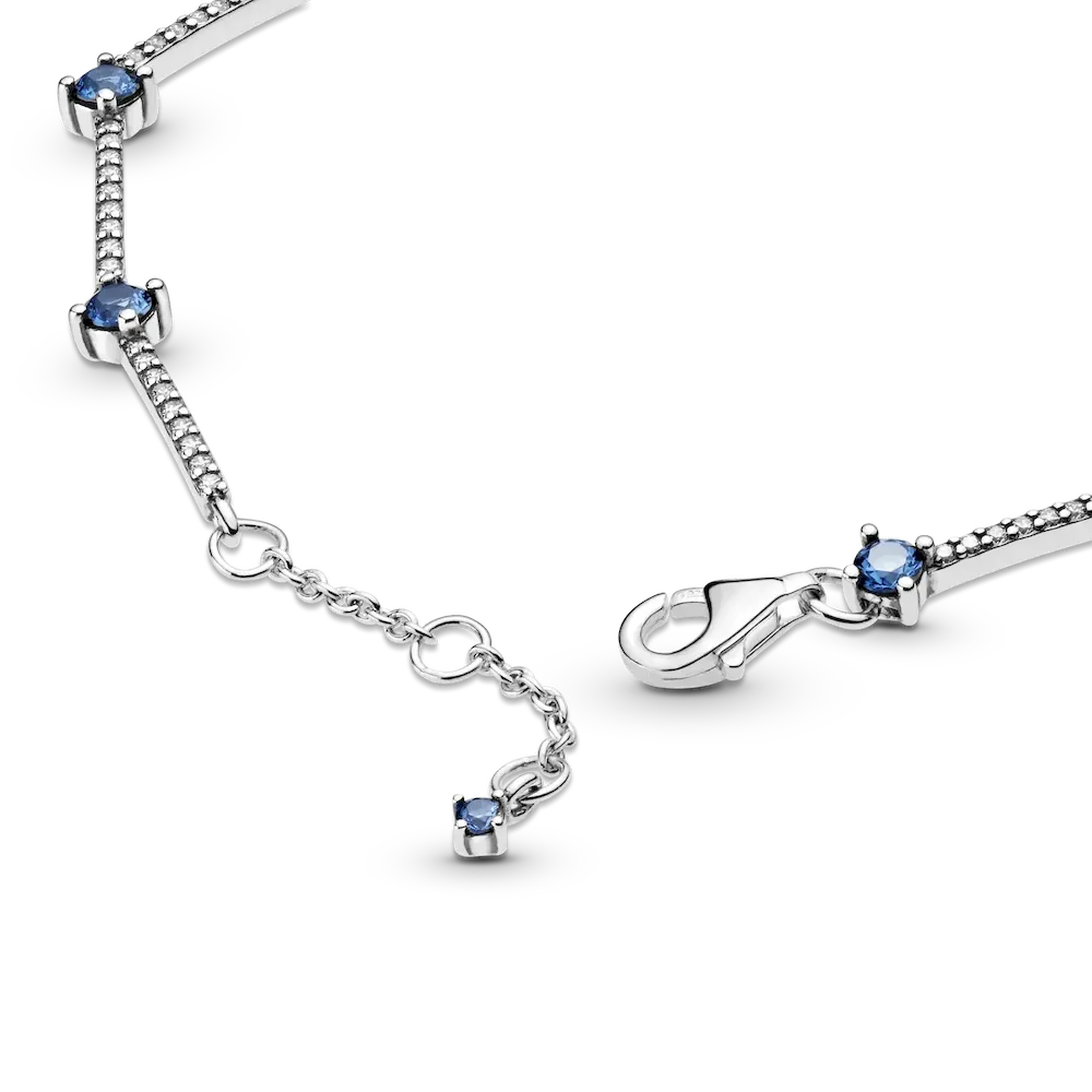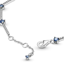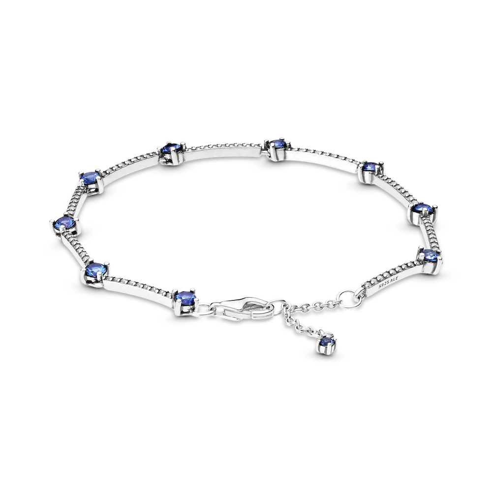 Level up your look with the Sparkling Pavé Bars Bracelet. Hand-finished in sterling silver, this design is inspired by a piece from Pandora’s archive. Featuring rigid bars decorated with smaller clear stones set between larger blue ones, this bracelet includes a lobster clasp closure with a stone dangle tag at the end. Adjustable in size, offset the cool tones of this bracelet with pieces hand-finished in Pandora Rose™ (14k rose gold-plated unique blend).