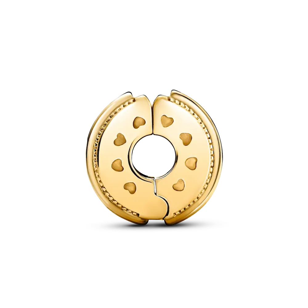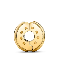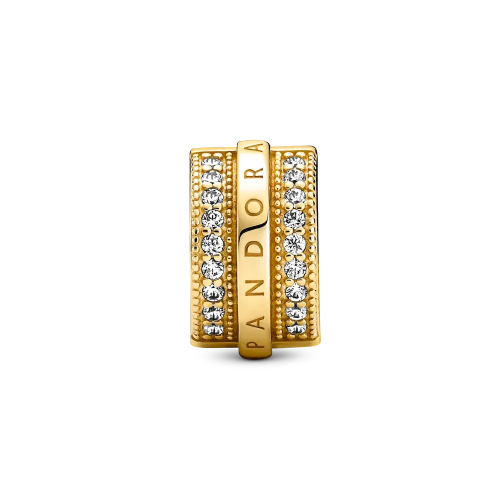 Give your look a stylish glow-up with the Sparkling Pavé Lines & Logo Clip Charm. Hand-finished in 14k gold plating, this charm features two sparkling rows of clear cubic zirconia pavé framed by micro-beading with a raised centre row featuring the Pandora logo. The charm’s sides are embossed with hearts and its edges are squared. This warm-toned charm will elevate any outfit with modern sophistication and signature sparkle.