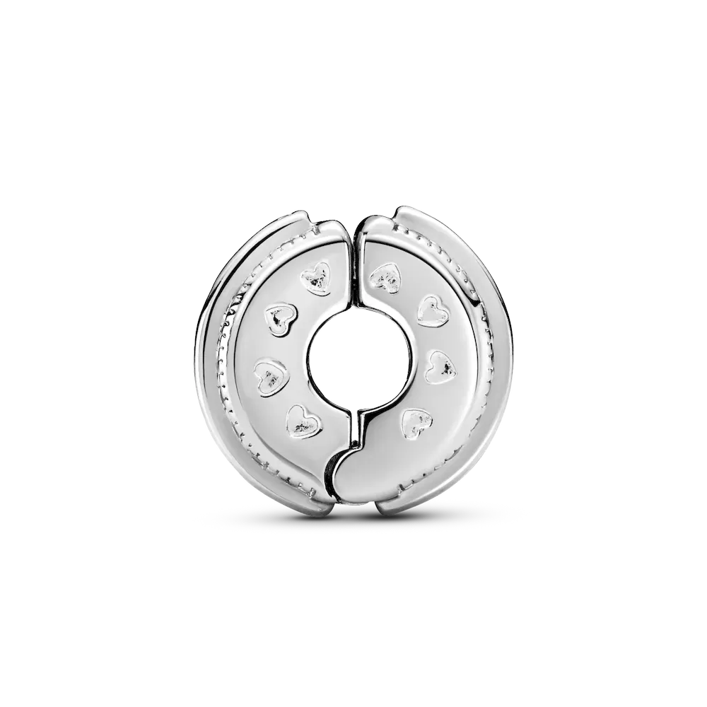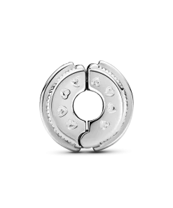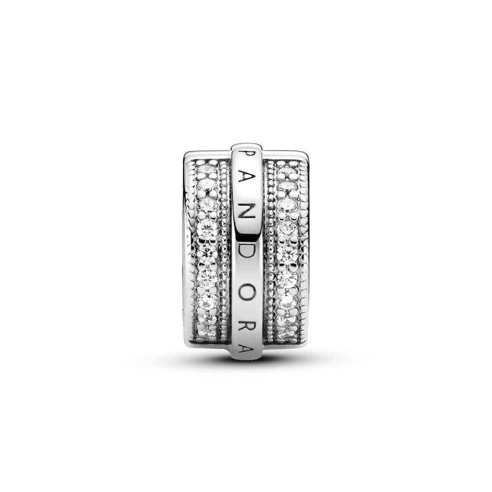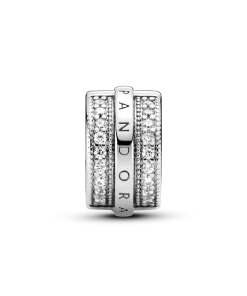 Make every day a little special with the Sparkling Pavé Lines & Logo Clip Charm. Hand-finished in sterling silver with two rows of bead-set clear cubic zirconia and a raised row with Pandora logo in the center, this clip charm can be worn to any event in any season and will make a sophisticated style statement. The sparkling pavé, embossed hearts and square edges bring intriguing detail to this instantly iconic piece. This clip charm features a silicone grip, does not fit onto threads (two raised charm dividers.) This charm can be styled anywhere else on the bracelet.