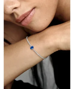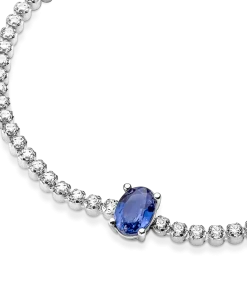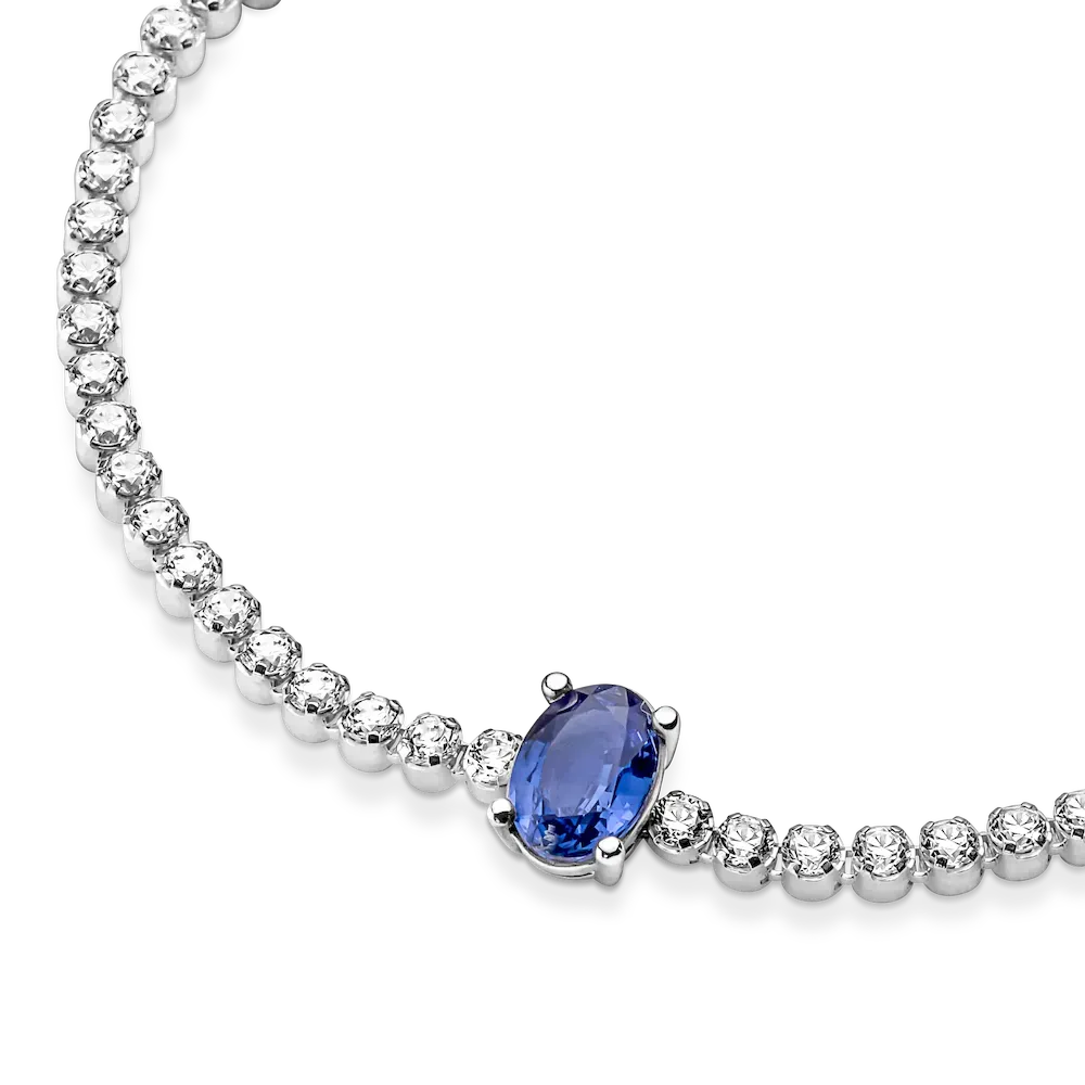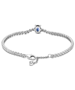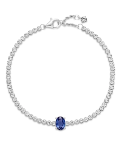 Bring elegance to your outfit with the Sparkling Pavé Tennis Bracelet. Hand-finished in sterling silver, this tennis bracelet features a large central prong-set oval princess blue crystal framed by a row of clear cubic zirconia pavé. The bracelet includes a lobster clasp for safe closure and can be adjusted to three lengths. Style this design on its own or with other shimmering Pandora Timeless pieces for a classic look that stands out.