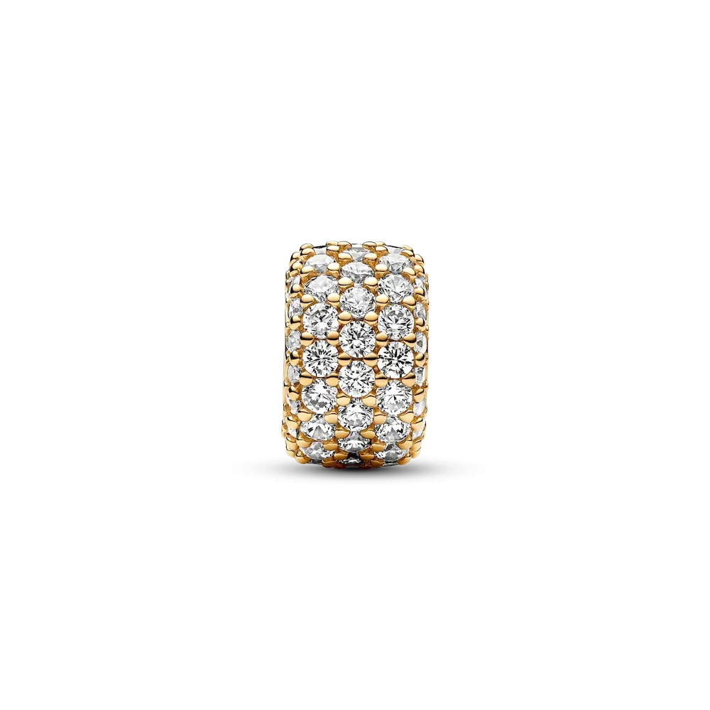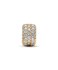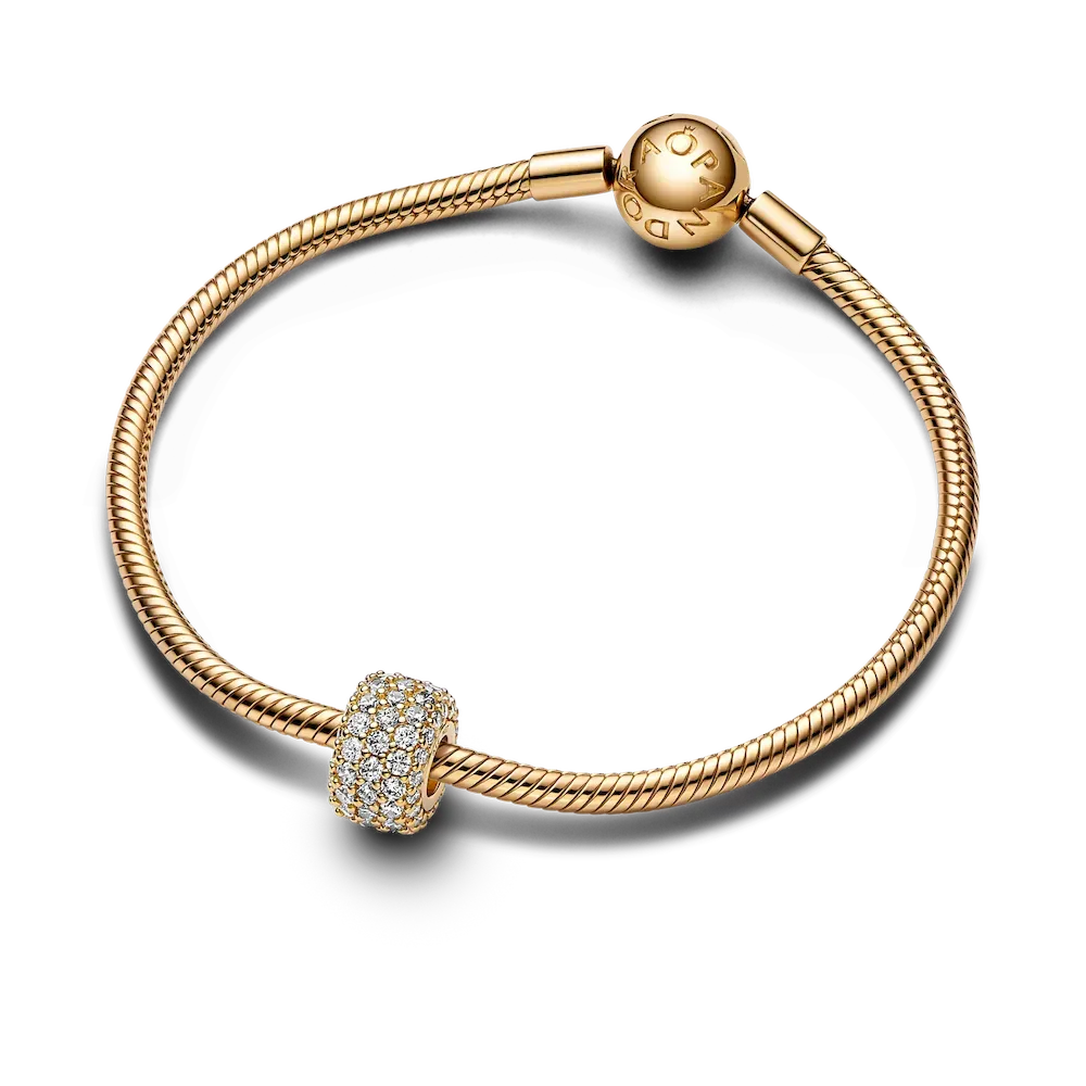 Shine on from every angle with a touch of sparkling pavé from our Pandora Moments collection. This 14k gold-plated charm is crafted from exactly 85 pavé-set round brilliant-cut clear cubic zirconia, making a bold addition to your collection of cubic zirconia charms. Elevate your everyday looks by adding this sparkling pavé charm to your favorite chain or bracelet.