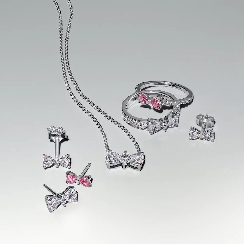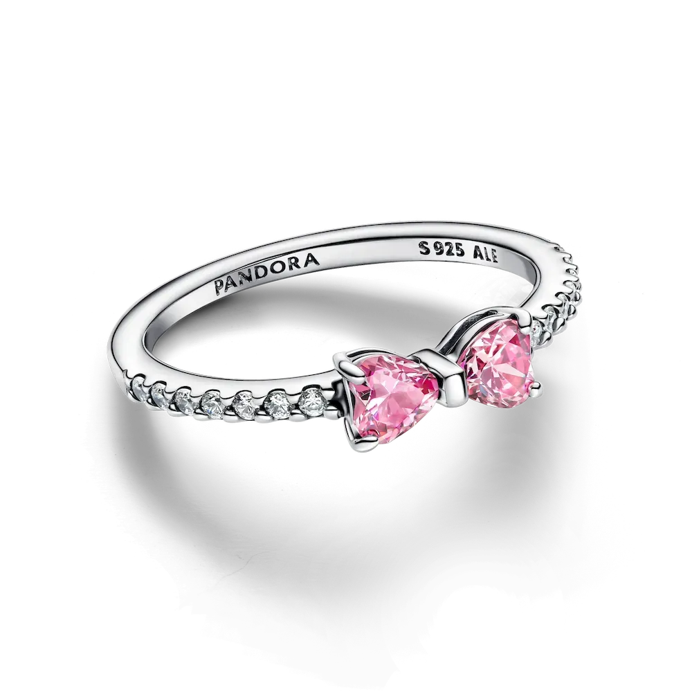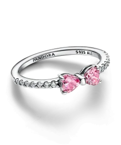 The Sparkling Pink Bow Ring in sterling silver features two heart-cut fancy pink cubic zirconia clear cubic zirconia and a pavé-adorned band. This unique bow motif ring embodies festive light and charm, perfect for any occasion.