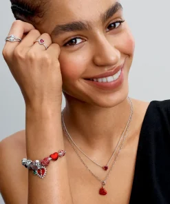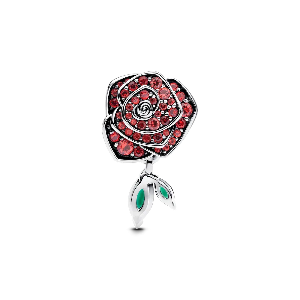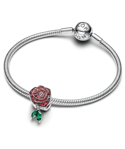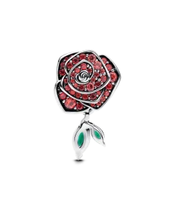 Embody floral elegance of our Sparkling Rose in Bloom Charm, a symbolic piece crafted in sterling silver. Intricately designed to capture the delicate nature of the flower, the charm features a layered petal effect to reflect the beauty of a rose in bloom and is covered with red man-made crystals. To lend an air of life-like details and movement, two green stones dangle beneath the flower representing leaves. Perfect as a gesture of love for someone close or as a meaningful addition to your collection, this Pandora rose charm is sure to keep the romance alive.