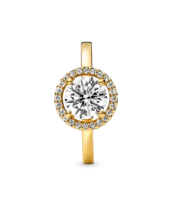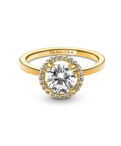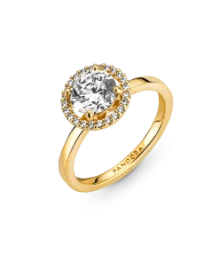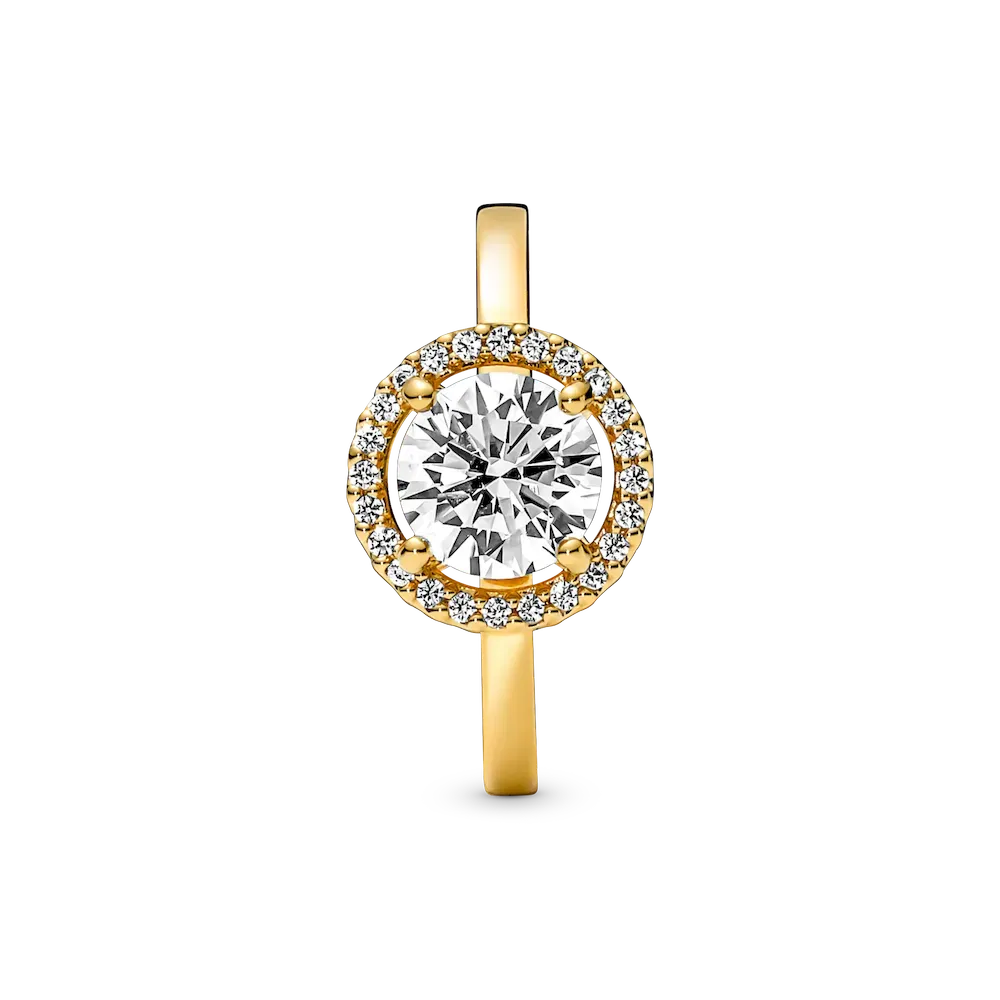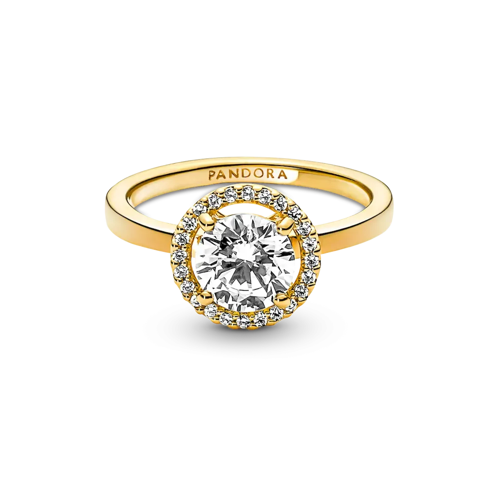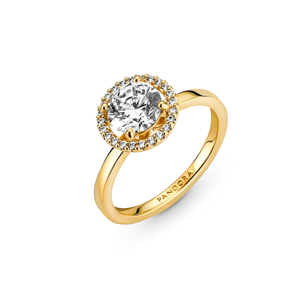 Classic yet modern, the 14k gold-plated Sparkling Round Halo Ring features a round center stone encircled by a halo of brilliant-cut clear cubic zirconia pavé. The Pandora logo is engraved on the inside of the shank. A timeless gift for an elegant Mom.