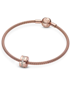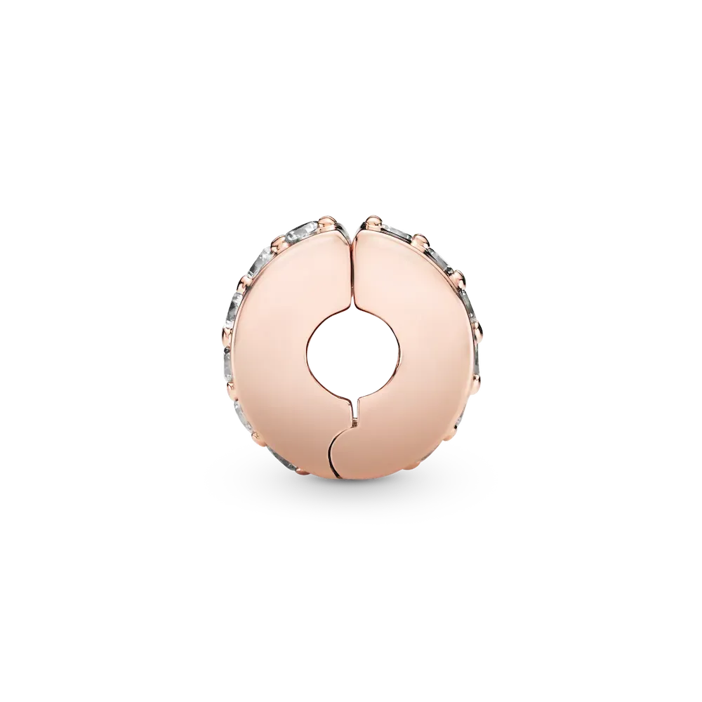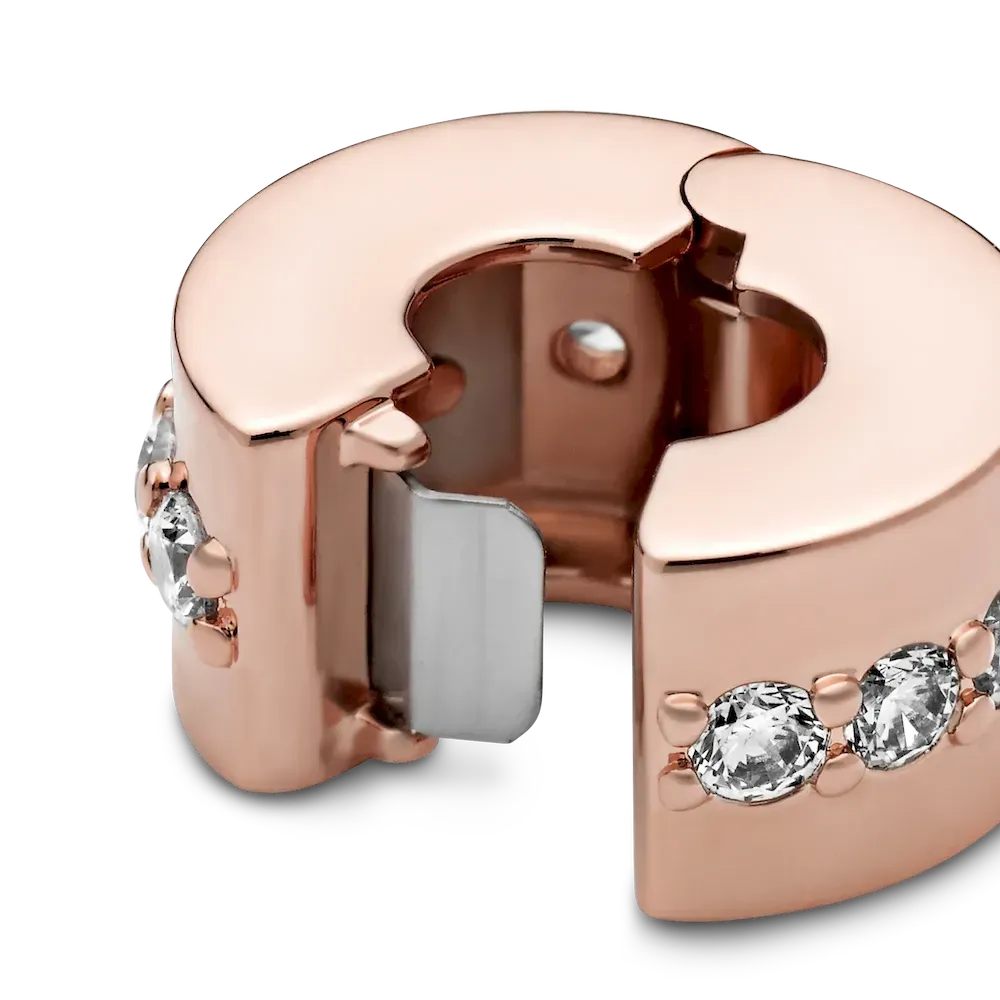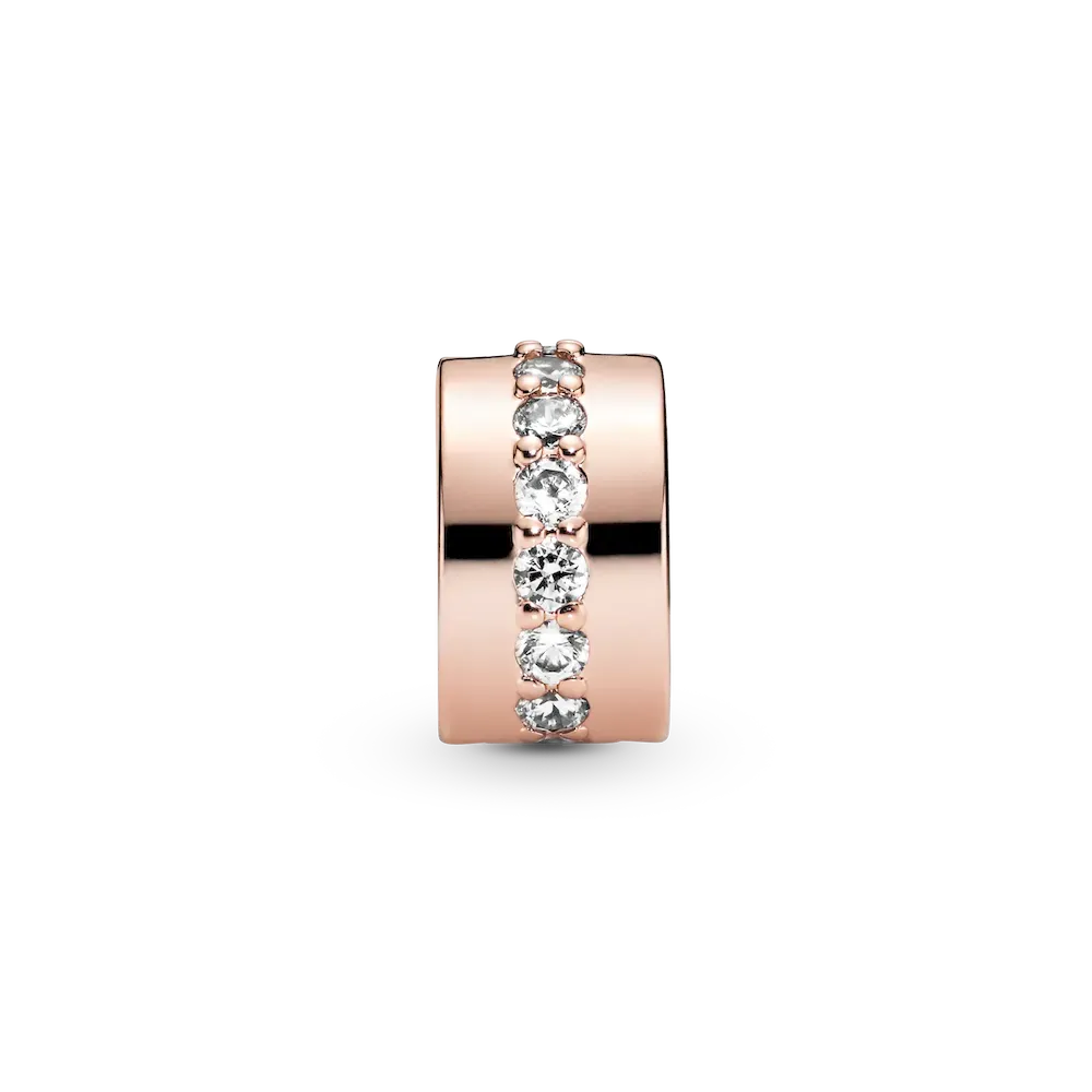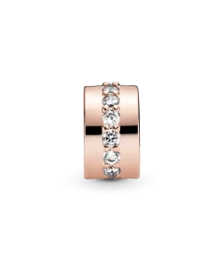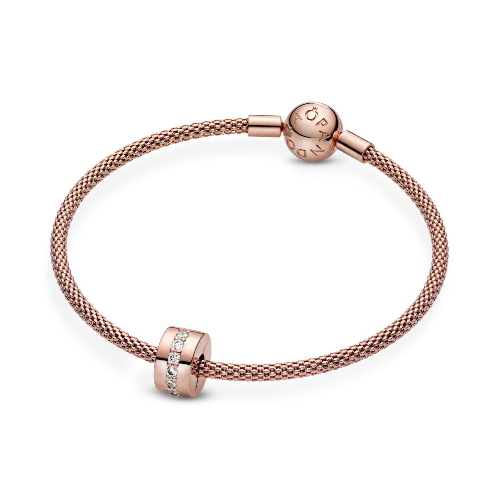 Light up your Pandora charm bracelet with this sparkling spacer charm. This sophisticated, 14k rose gold-plated piece is accented with a decorative line of shimmering cubic zirconia stones. Designed with a hidden silicone grip, this stunning Pandora spacer will keep your charms perfectly positioned while adding a touch of sparkle. This clip charm features no silicone grip, so it will slide if not styled onto threads (two raised charm dividers).