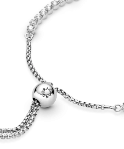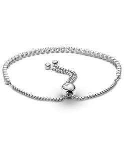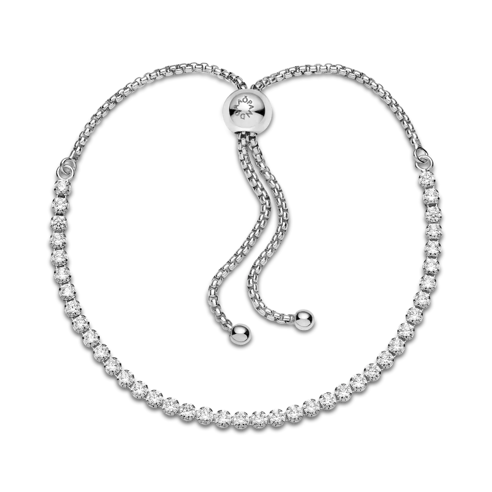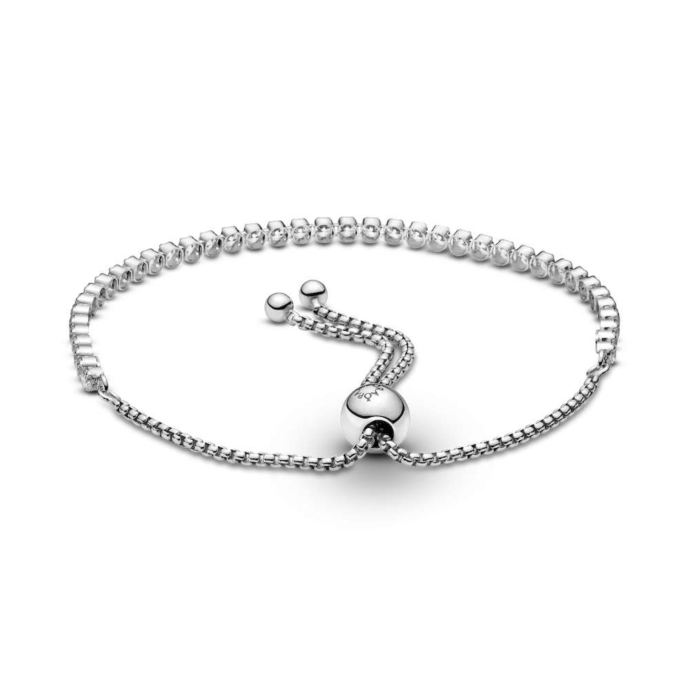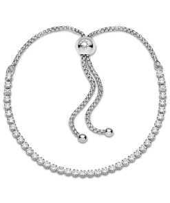 Tennis anyone? Upgrade your style game with Pandora’s modern twist on the timeless tennis bracelet. Crafted in rhodium-plated sterling silver, this statement piece is embellished with sparkling cubic zirconia stones and features a chic sliding clasp, making it easy to adjust to your wrist size. Wear it solo or layered with other Pandora bracelets, for a fun and modern look.
