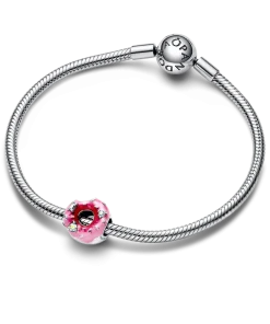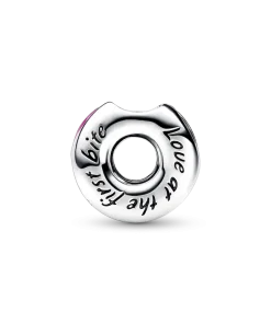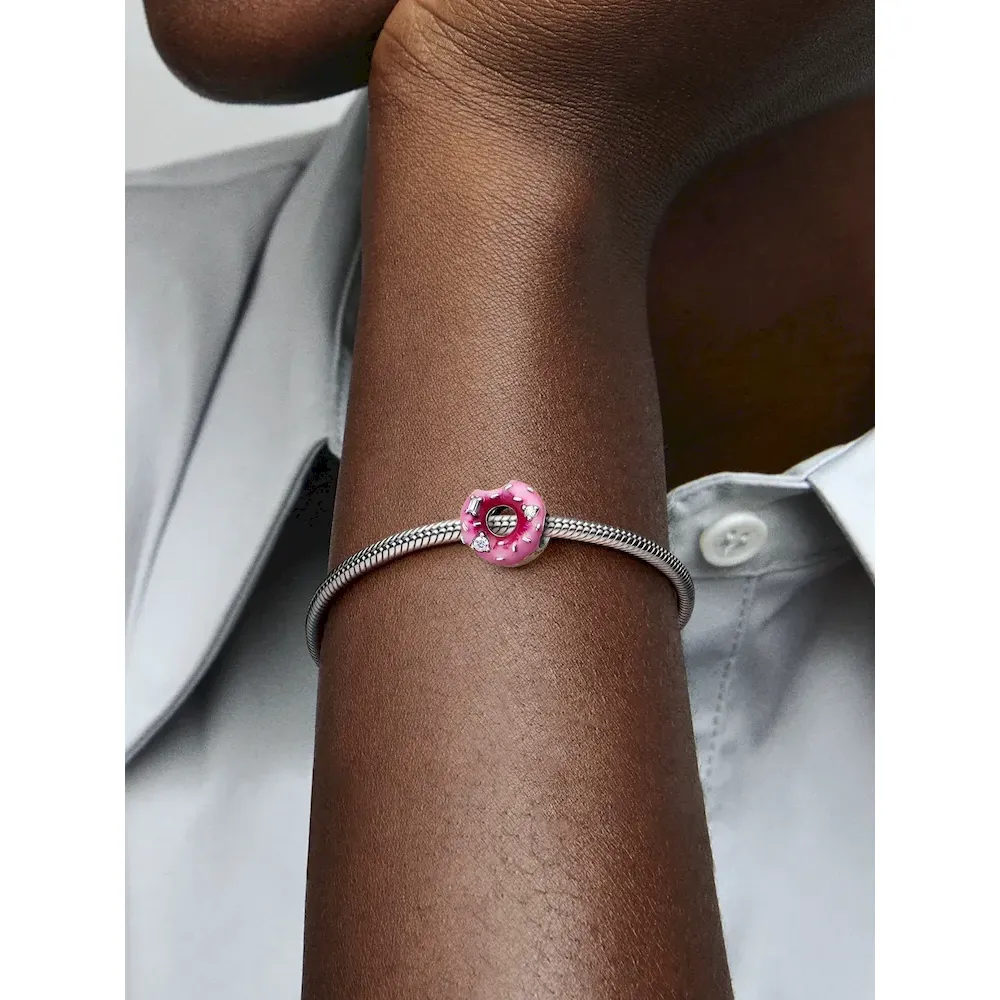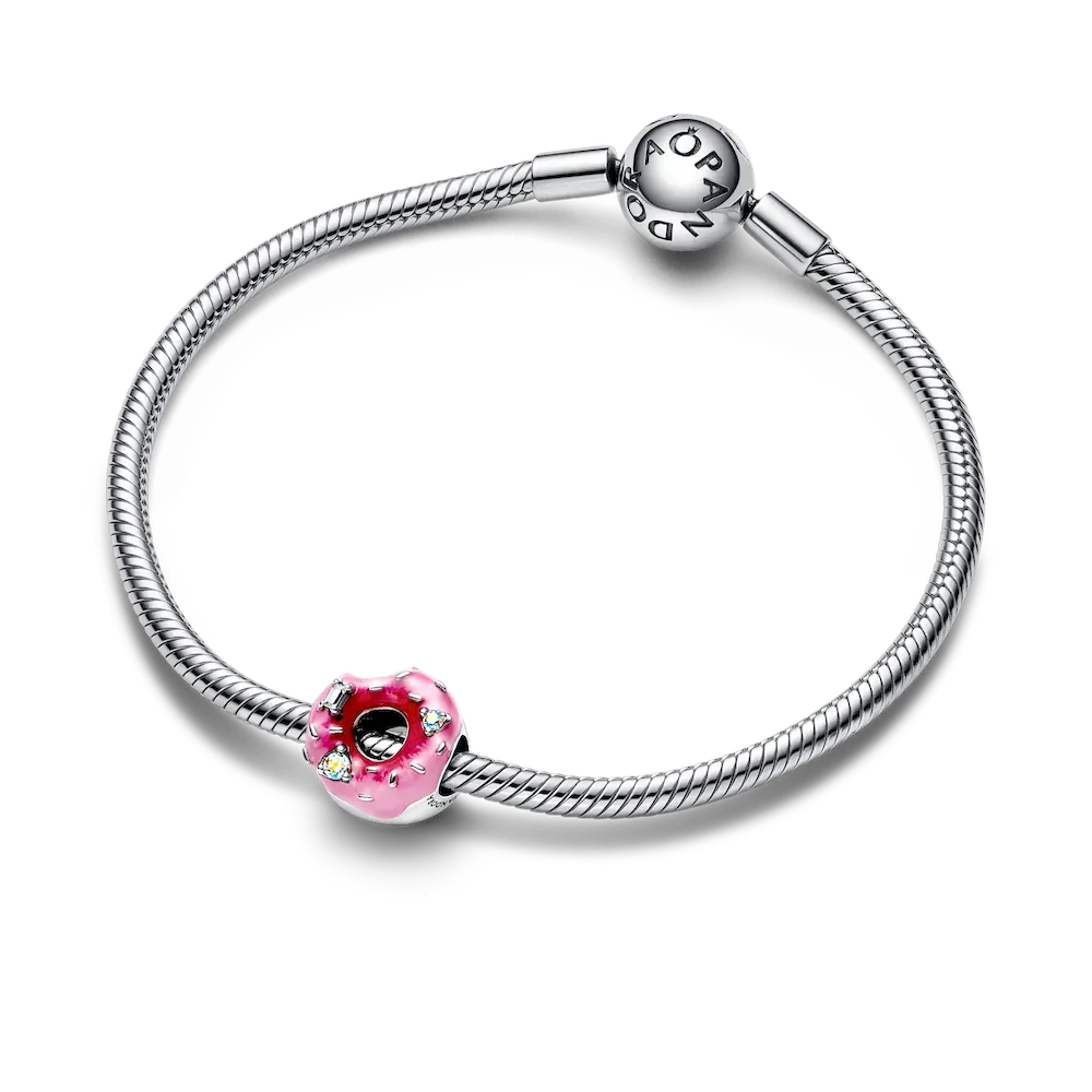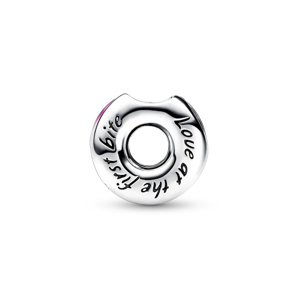 A jewelry gift as sweet as your love. The Sparkling Sprinkled Donut Charm is inspired by a universe of pop art and saturated candy colours. This playful yet modern charm takes the shape of a donut in sterling silver, complete with hand-applied pink gradient enamel frosting and a bite taken out of one side (who can resist a delicious donut?). The frosting is topped with polished silver sprinkles, one clear cubic zirconia and two Aurora Borealis cubic zirconia – shimmering with clear, pink and blue tones depending on how the light hits. The back is engraved with the words