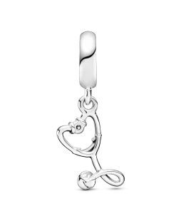 Celebrate hardworking medical professionals with the Stethoscope Heart Dangle Charm. A stethoscope twisted into a heart shape, this piece is hand-finished in sterling silver. One bezel-set cubic zirconia appears at the top of the charm, while small beads feature around the edge of the hollowed-out chest piece for added detailing. Ideal for someone who has a lot of heart, this piece would make a great addition to any Pandora Moments bracelet.