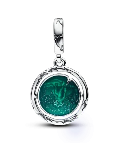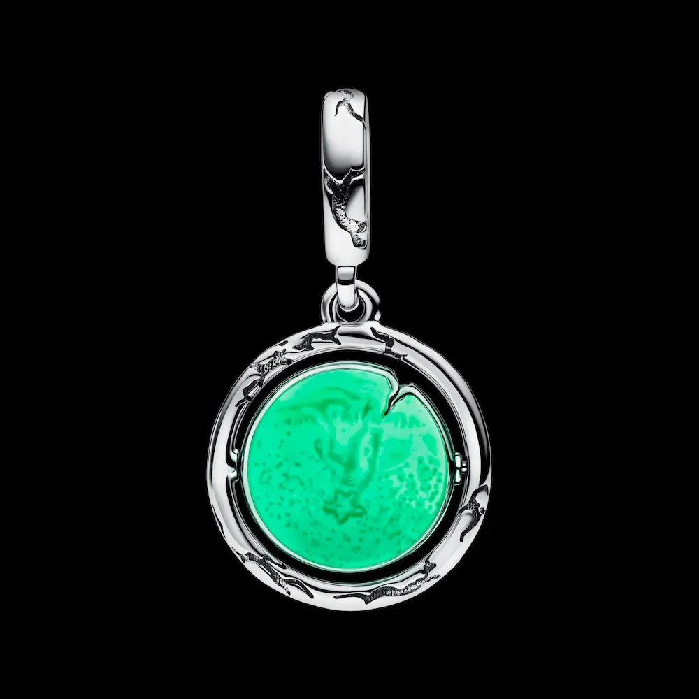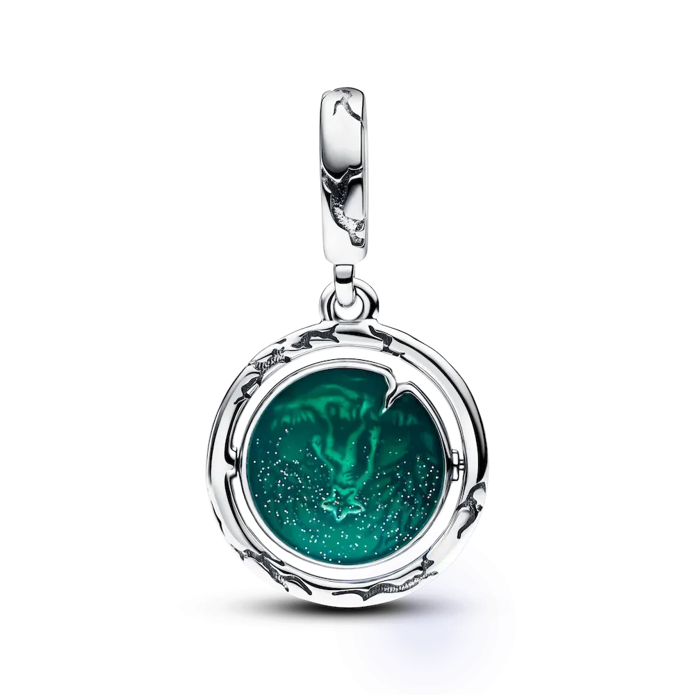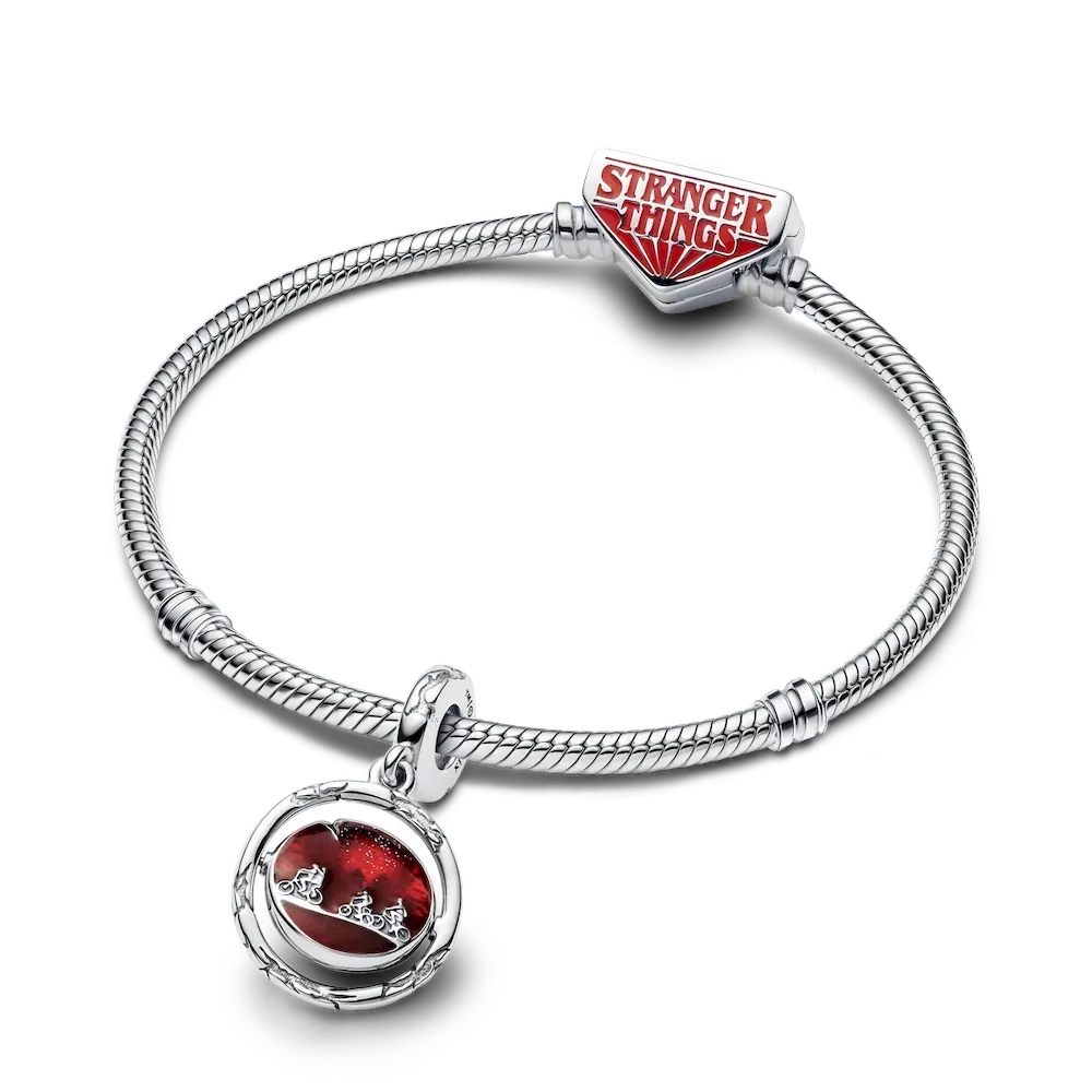 Keep your friends close and your monsters in check with our Stranger Things Glow-in-the-dark Upside Down Dangle Charm. Crafted in sterling silver, this spinnable charm features glow-in-the-dark enamel and two iconic scenes fans of Stranger Things will love. On one side, the gang is riding their bikes on a mission through Hawkins. On the other, the Demogorgon stalks through the woods.