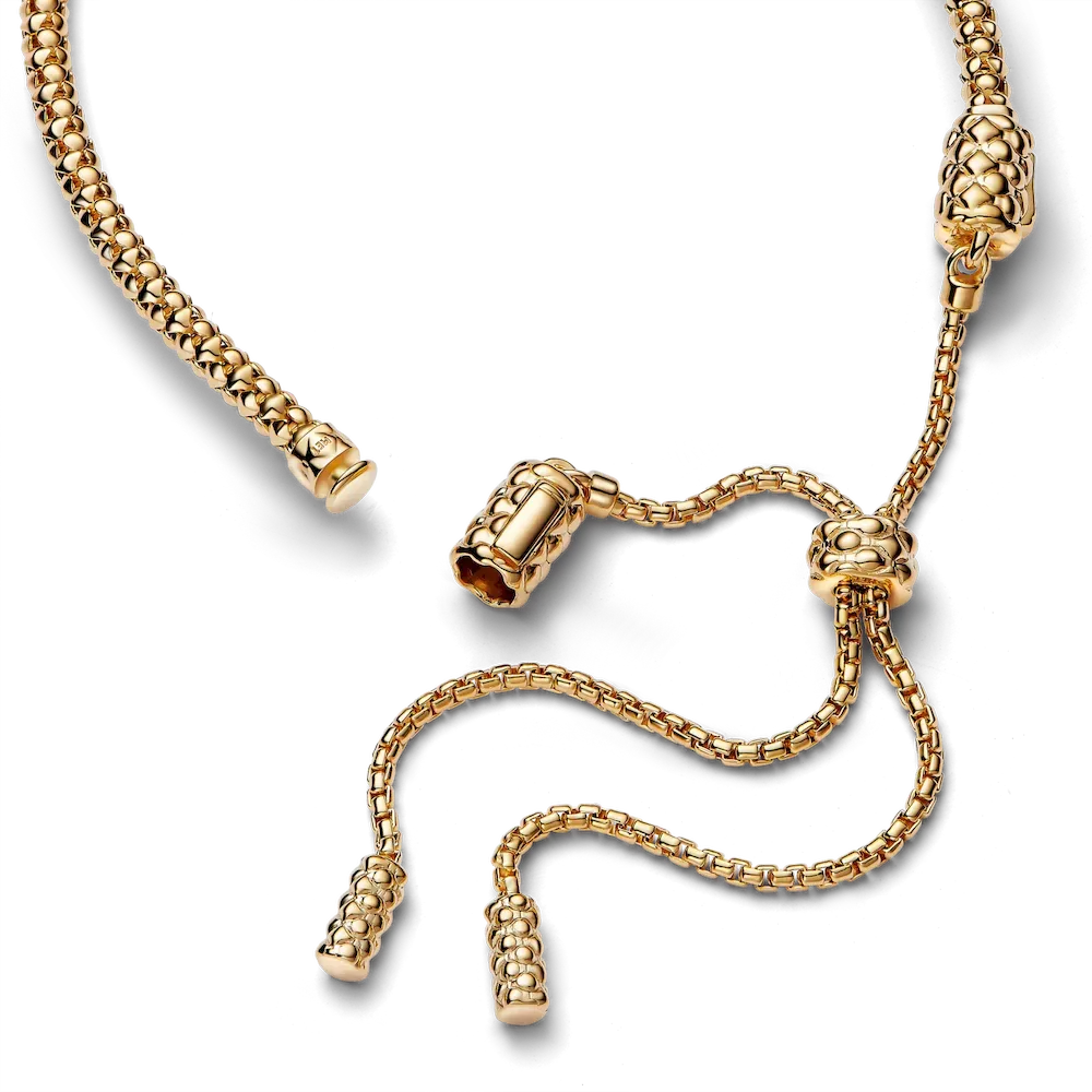 Our Studded Chain Slider Bracelet is the ultimate versatile carrier, adjustable to any length thanks to its slider clasp. Crafted in 14k gold plating, one size fits all. The bracelet has a flexible core for easy movement, while its sliding silicone ball on the slimmer chain allows for size adjustment, so you can find your perfect fit every time. Customize yours with up to 10 charms or dangle charms of your choice to make it extra personal.