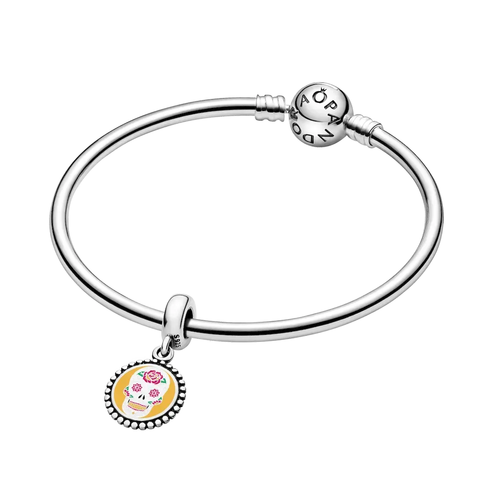Celebrate life and love with the Sugar Skull Dangle Charm. Hand-finished in sterling silver, this vibrant charm showcases a sugar skull design, symbolizing Día de los Muertos and the honoring of loved ones who have passed. Adorned with bright colors—pink, green, and orange, it captures the lively spirit of the celebration. This charm is a tribute to remembrance, joy, and colorful traditions.