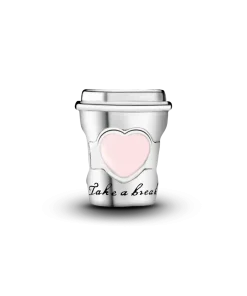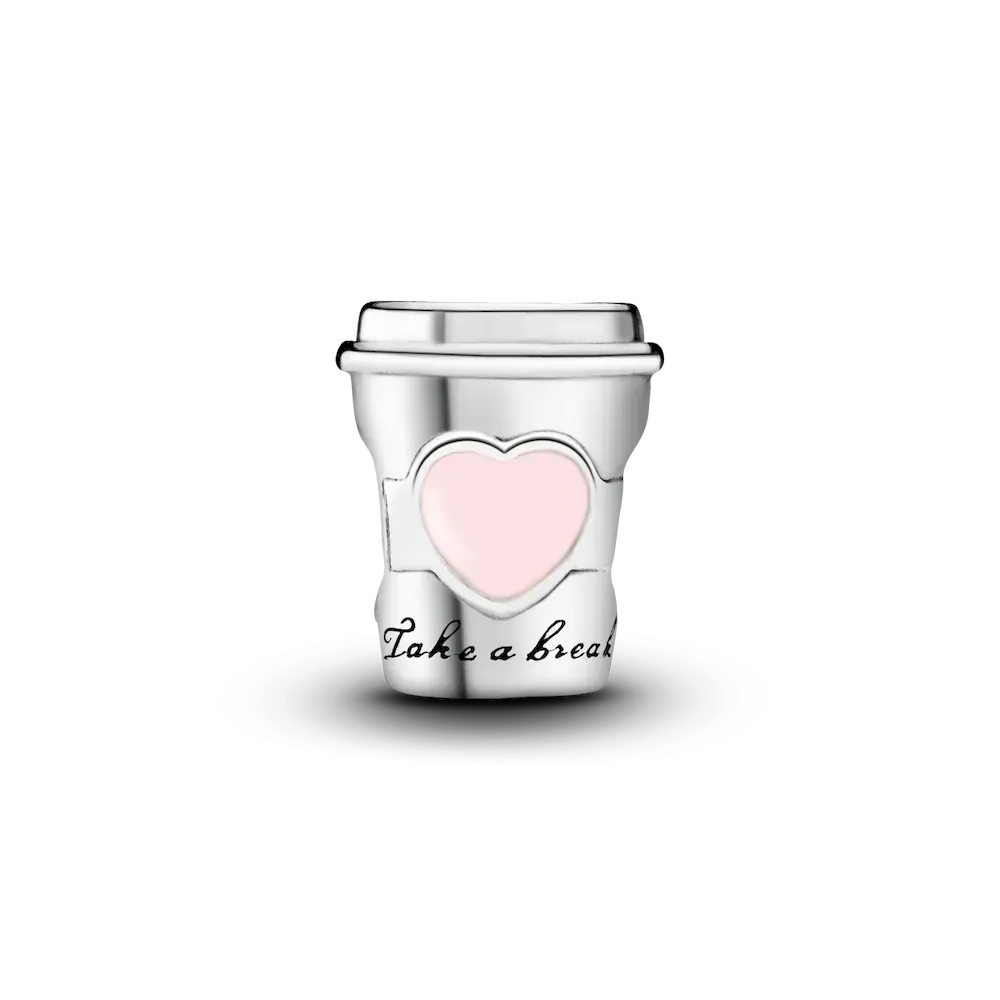 Looking for a style pick-me-up? This sterling silver charm is sure to give your style a boost. Shaped as a to-go coffee cup, it’s detailed with a pink enamel heart, the Pandora logo and the engraving