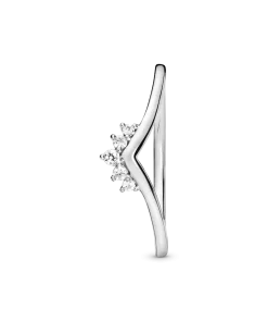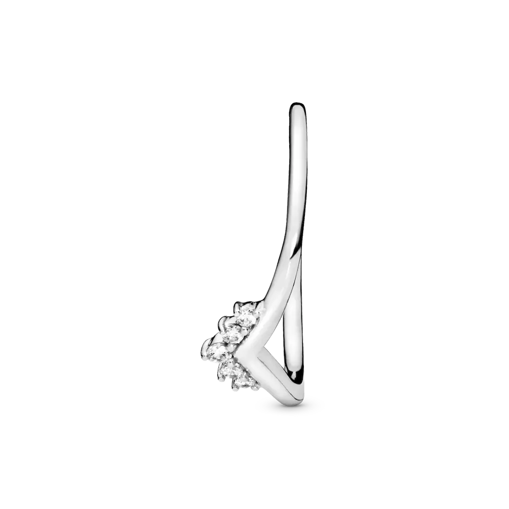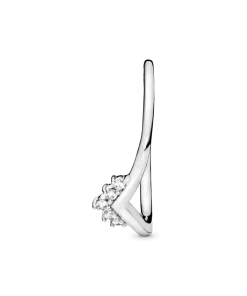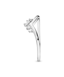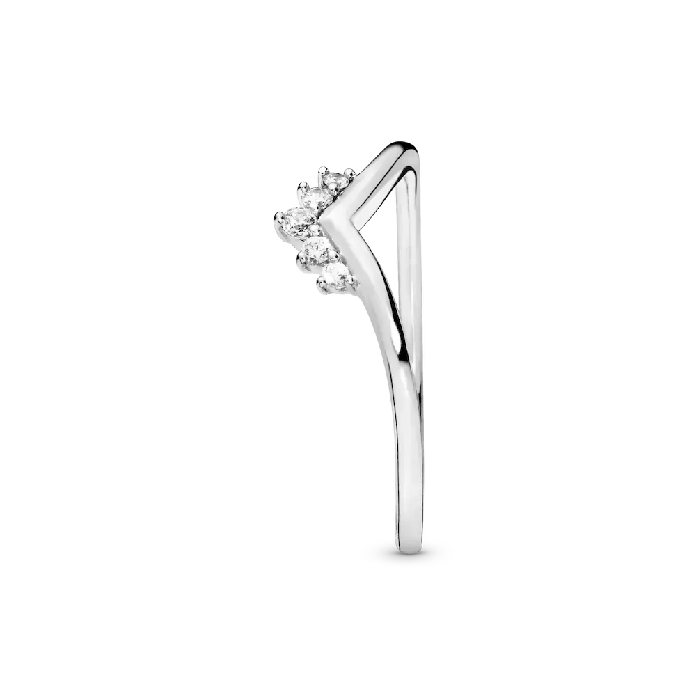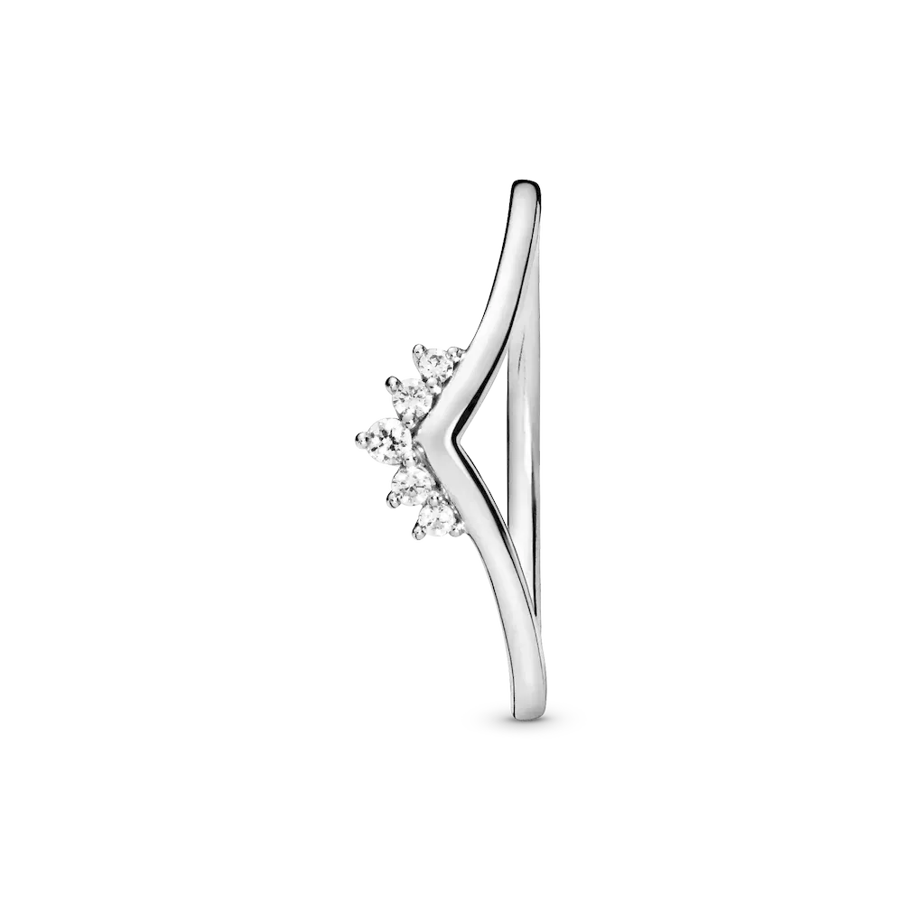 Turn heads wherever you go with this Tiara Wishbone ring hand-finished in smooth and polished sterling silver. The stackable wishbone ring features five claw-set clear cubic zirconia that form a delicate tiara crown on top of the ring. It’s perfect worn by itself or can be used to create more drama when stacked with wishbone rings in mixed metals, like sterling silver and Pandora Shine™ (18k gold-plated sterling silver), depending on the feeling you’re looking for.