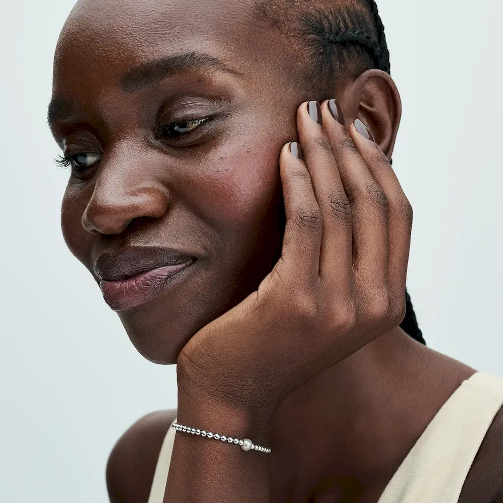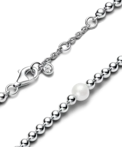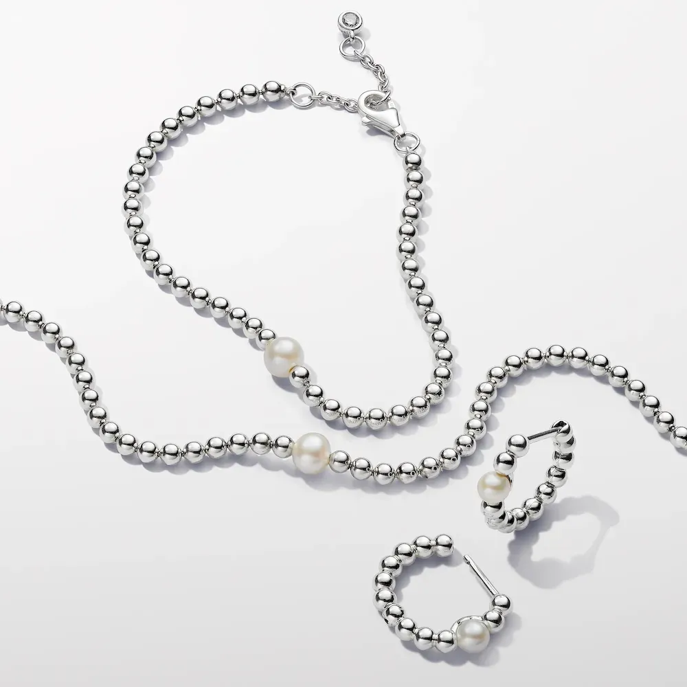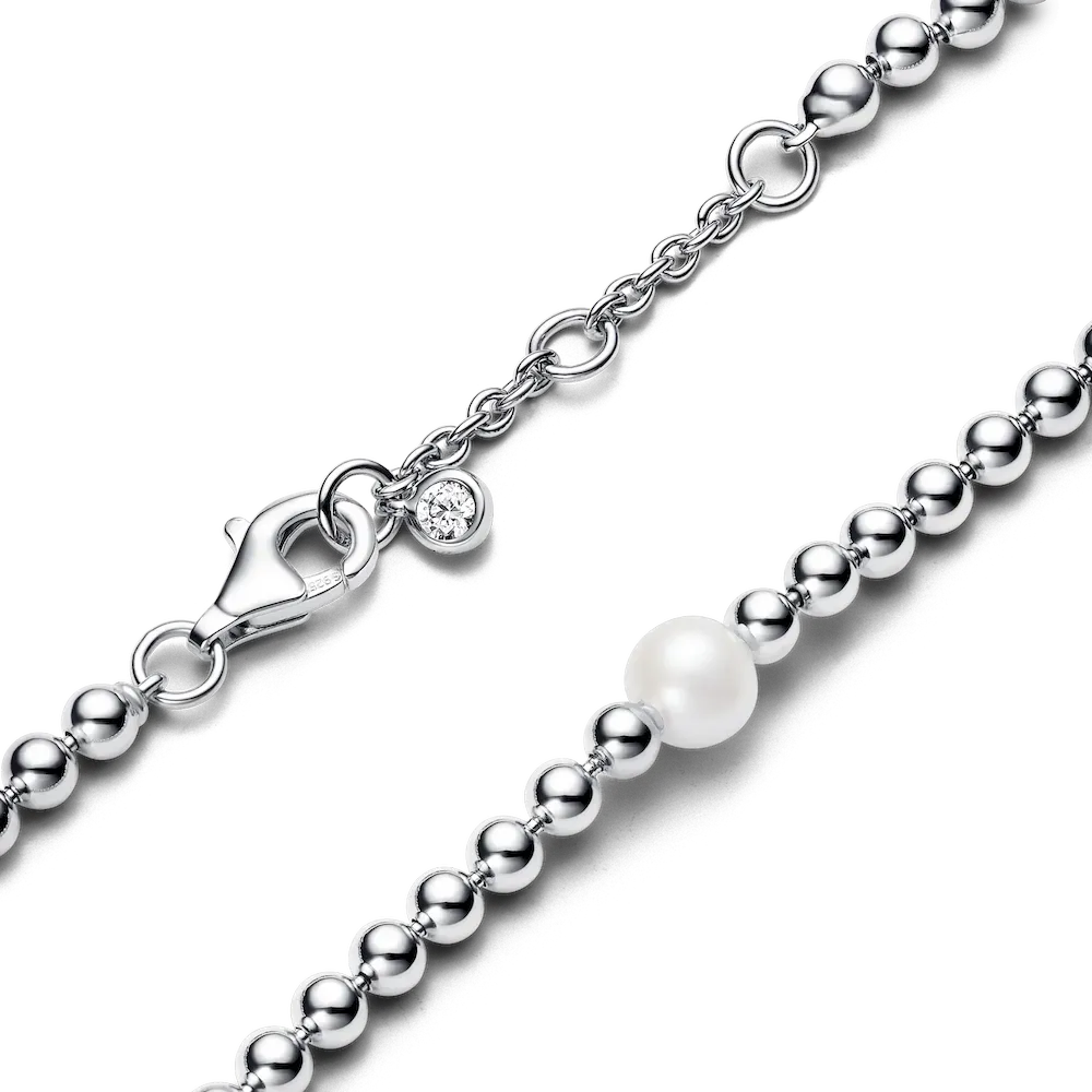 Embrace shine with our Treated Freshwater Cultured Pearl & Beads Bracelet in sterling silver. A central pearl, surrounded by polished metal beads, captures the essence of Pandora Timeless. A hint of sparkle from a cubic zirconia shines by the lobster clasp, bringing subtle shine. Versatile and symbolic, treated freshwater cultured pearls embody beauty, wisdom, and love. Please note each treated freshwater cultured pearl is unique and can vary in size and color; normal wear and tear may occur with this material. Our freshwater cultured pearls are treated with bleaching and luster enhancement.