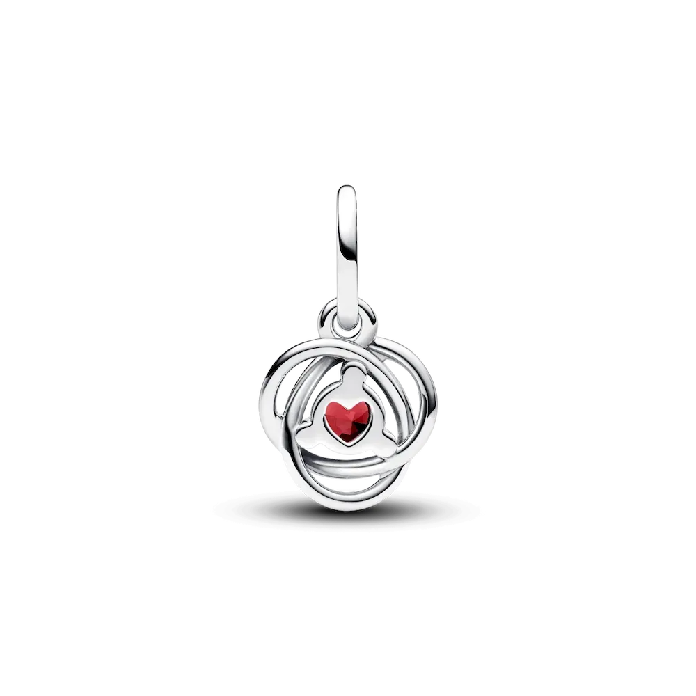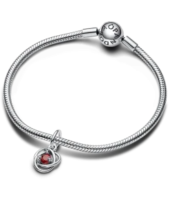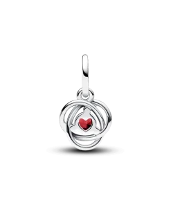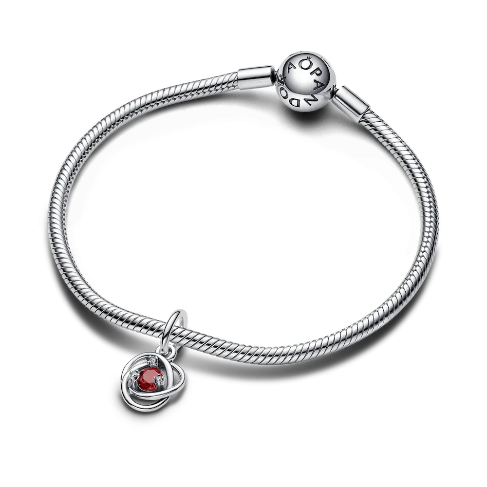 This intricate True Red Eternity Circle Dangle Charm is a must-have for your Pandora Moments collection. Crafted in lustrous sterling silver, it features an openwork infinity braid decorated with a central true red manmade crystal, elegantly set with three clear cubic zirconia. The intricate design symbolizes eternity and adds an additional layer of meaning to the piece. Elevate your bracelet with this timeless piece or gift it as a representation of an everlasting bond.