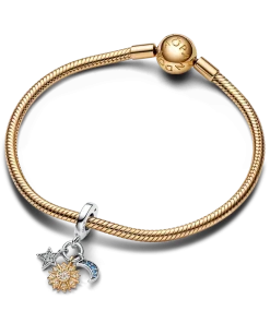 Bring a sprinkling of celestial magic to your jewelry styling with the Two-tone Celestial Triple Dangle Charm. This charm combines three celestial icons: a sun motif in 14k gold plating with sparkling stones and microbeads, a sterling silver star with clear pavé and a sterling silver crescent moon with deep blue stones. Wear it as a symbol of balance and harmony, in the cosmic dance of the universe and within ourselves.
