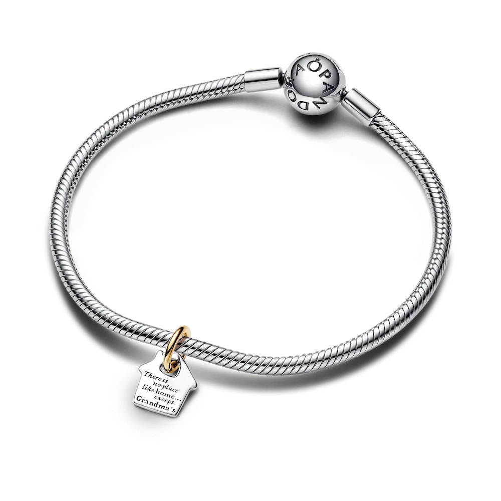 Carry the heart of family sentiment everywhere you go with our Two-tone Grandma’s House Dangle Charm. Keep your loved ones close with our grandma charm that captures the essence of home. With a two-tone finish, crafted in sterling silver and featuring a 14k gold plating, this charm features a house-shaped disc with a whimsical heart-shaped cut-out on the roof. One side is engraved with