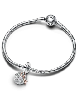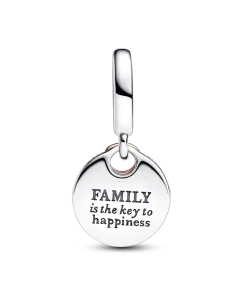 Unlock joy with the Two-tone Key To Happiness Double Dangle Charm. Crafted from sterling silver and featuring 14k rose gold plating, this two-one dangle charm features a round disc adorned with sparkling details. Engraved with