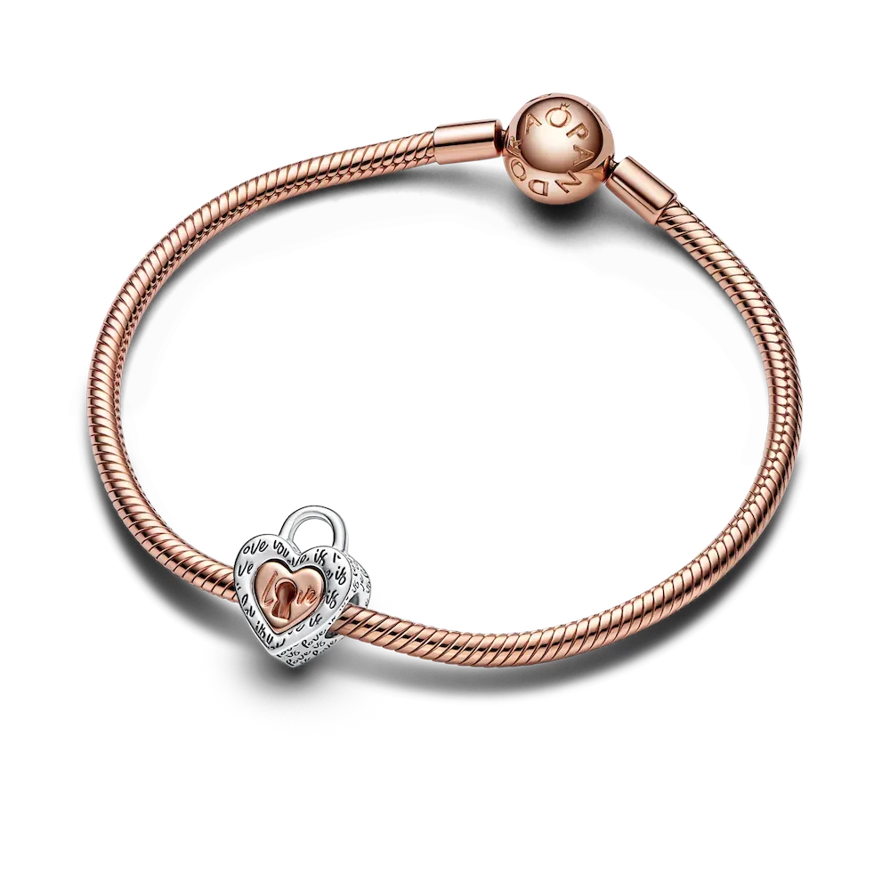 Share the love with our Two-tone Padlock Splittable Heart Charm. Hand-finished and engraved in multiple places with the message “Love is love”, this sterling silver charm features a 14k rose gold-plated removable inner heart detailed with a keyhole cut-out that forms the ‘o’ in its “Love” engraving. Wear the charms together, separately or split the charm with someone special.