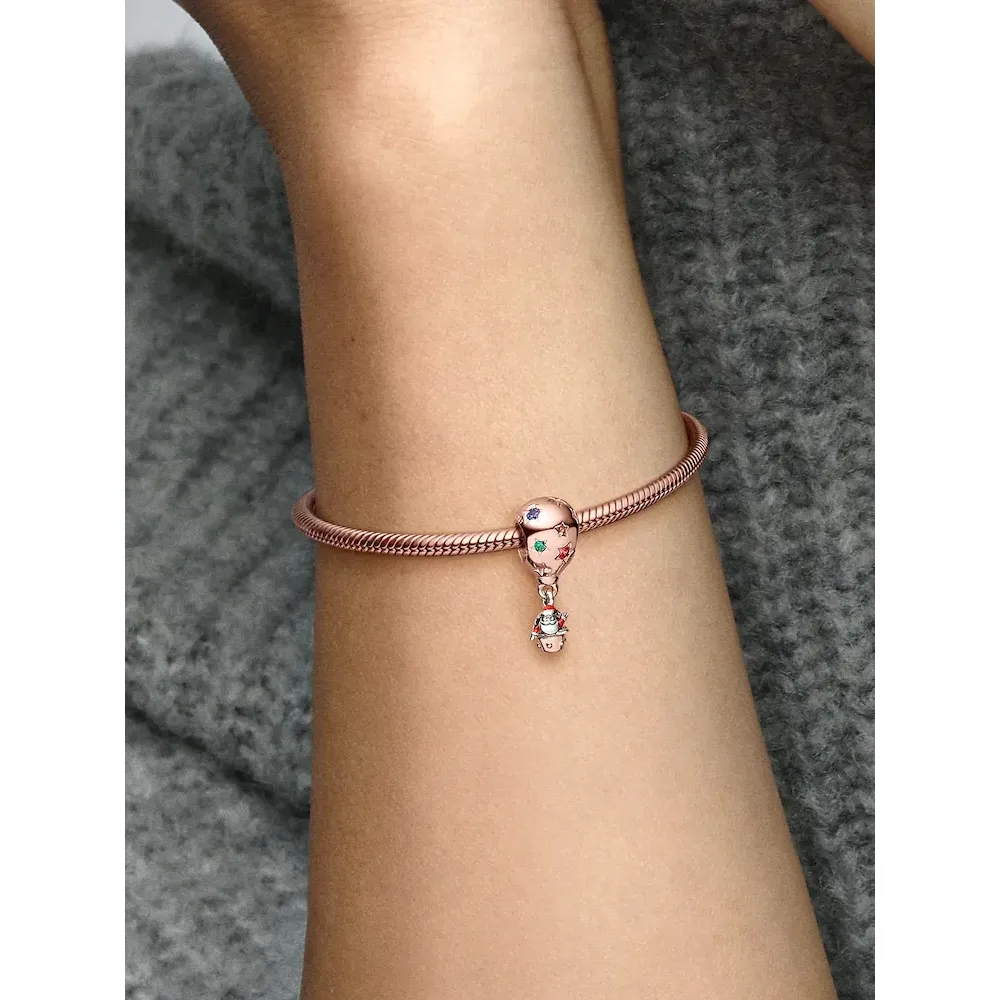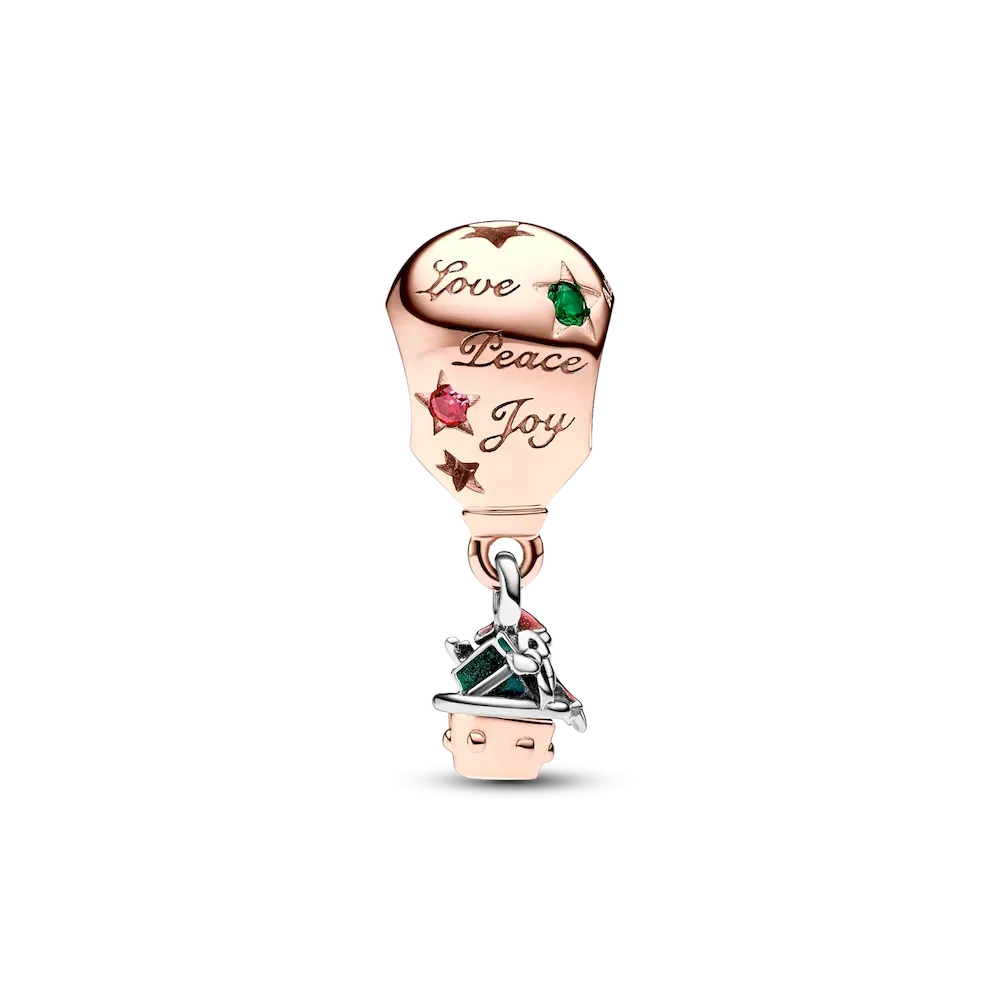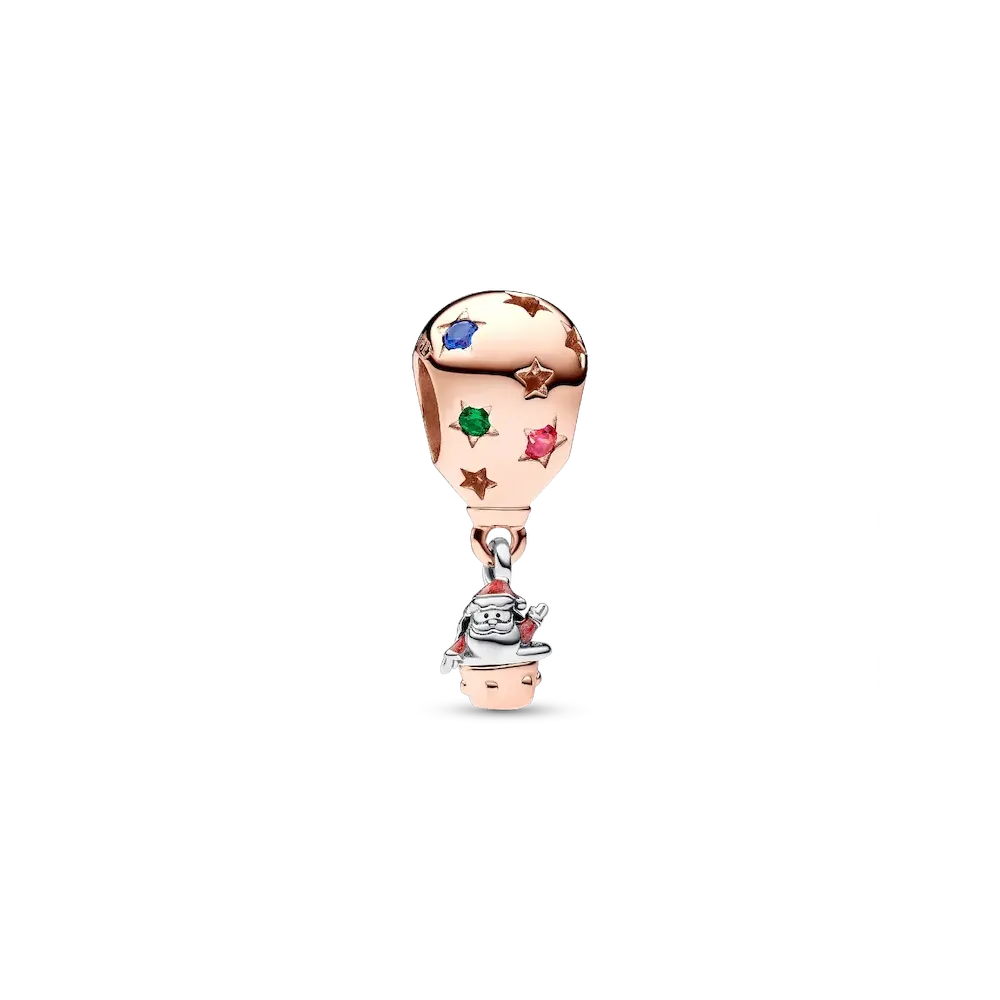 Tis the season for the Two-tone Santa Claus in Hot Air Balloon Charm. Crafted from sterling silver and 14k rose gold plating, one of this year’s most playful holiday charms features enamel detailing and festive-colored stones in star-shaped settings. The main character of Christmas gets a fun new mode of transport, hitching a ride in a hot air balloon that also features the message