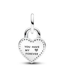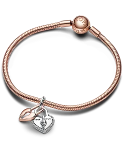 Unlock a secret message of love with the Two-tone Twistable Heart Padlock Double Dangle Charm. This dangle charm features two heart-shaped discs, a 14k rose gold-plated disc with a keyhole cut-out in front of a sterling silver disc with a twistable bar. Turn the bar to