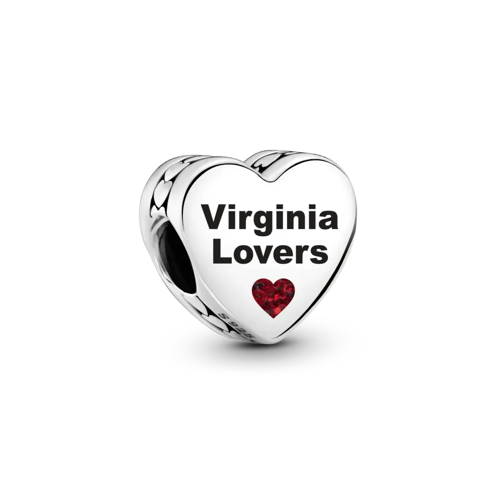 Virginia’s breathtaking countryside comes to life on this heart-shaped charm in sterling silver. One side captures the beauty of rolling hills, clear blue skies, and blooming dogwood flowers in glossy enamel. On the other side features “Virginia Lovers” in black lettering with a lovely red heart underneath. Wear your love on a stylish charm, pictured with the place you call home.