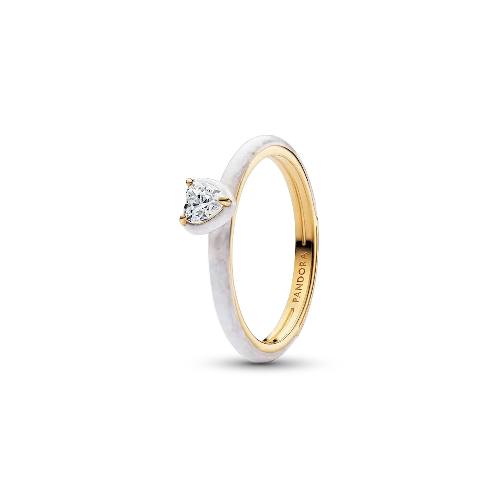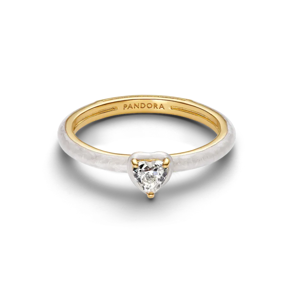 Wear a universal symbol of love and connection. This 14k gold-plated solitaire ring features a sparkling heart-shaped stone wrapped in shimmering enamel.