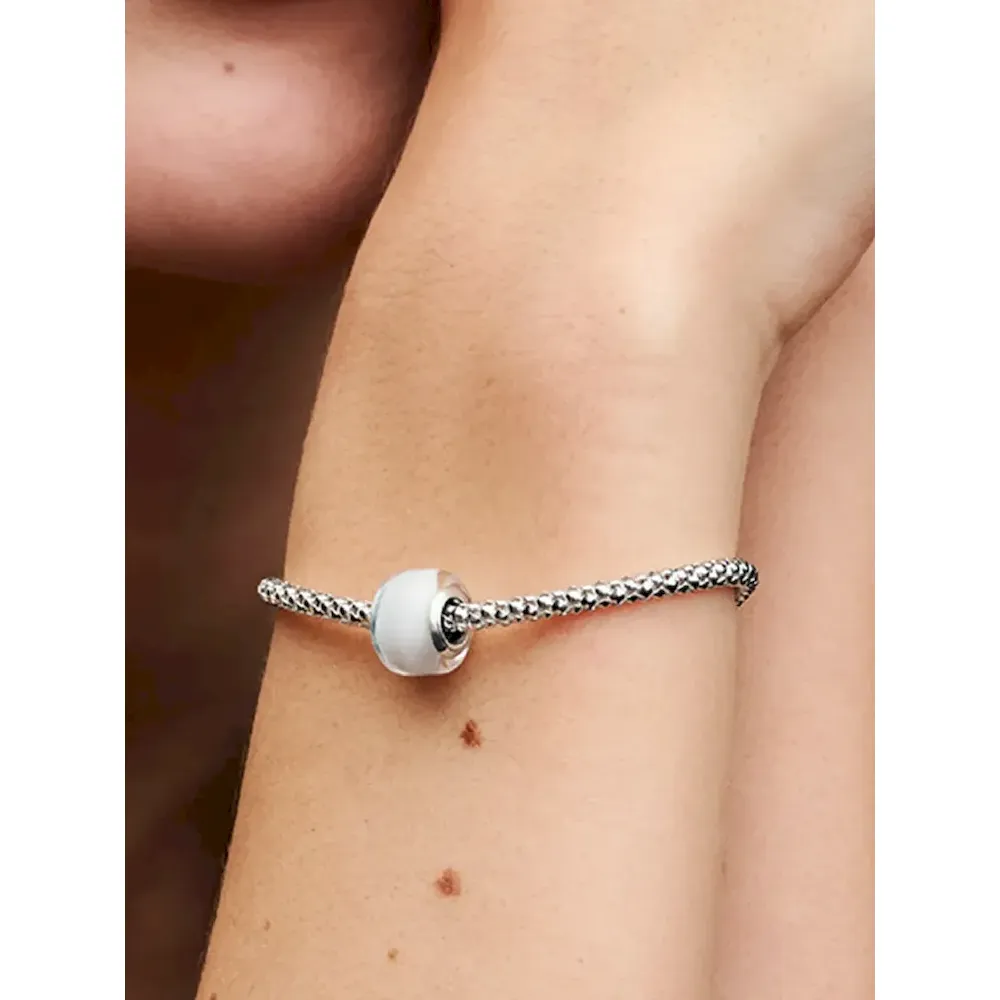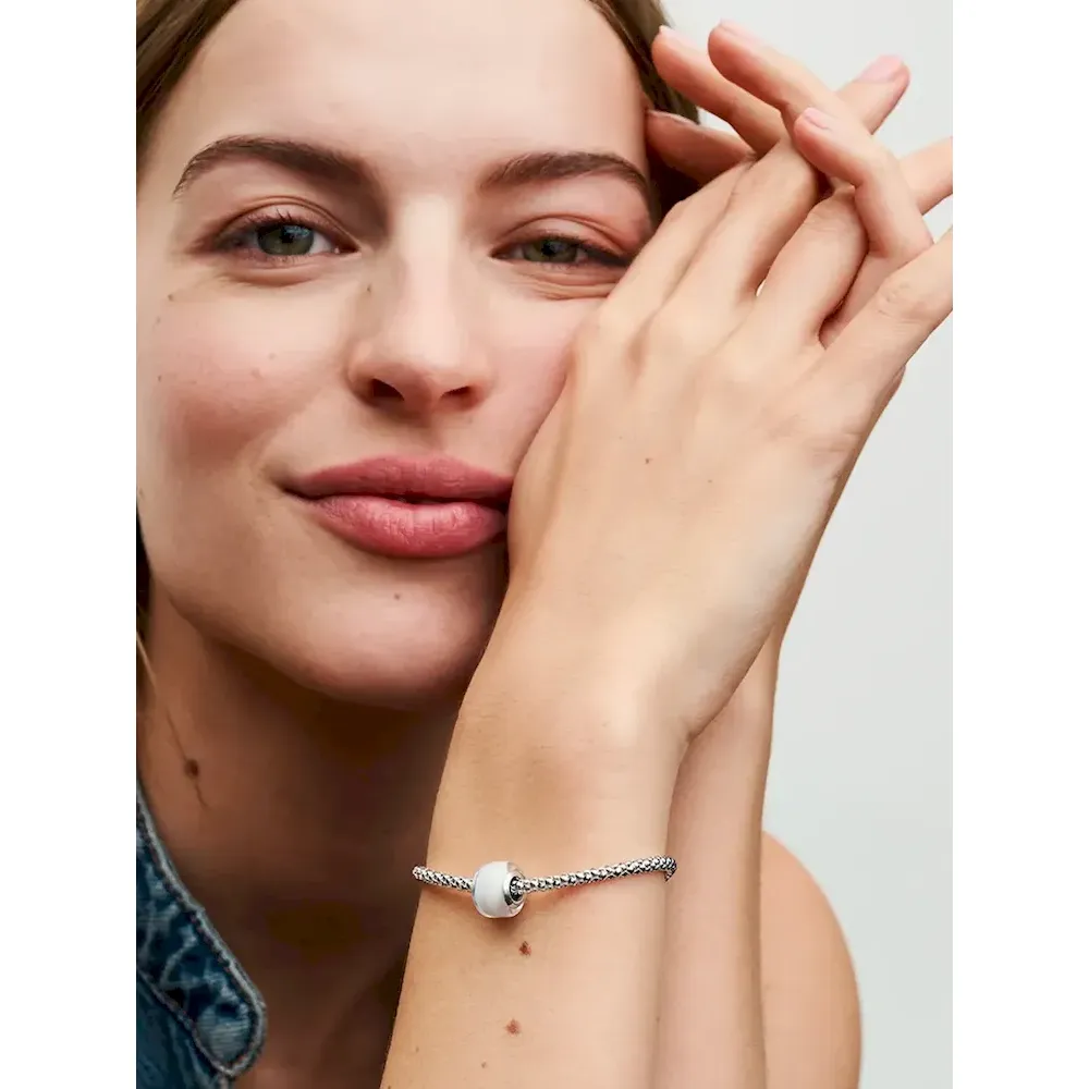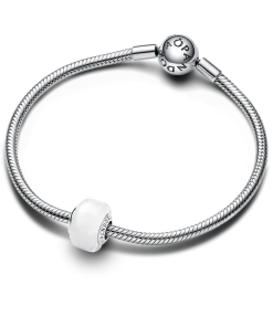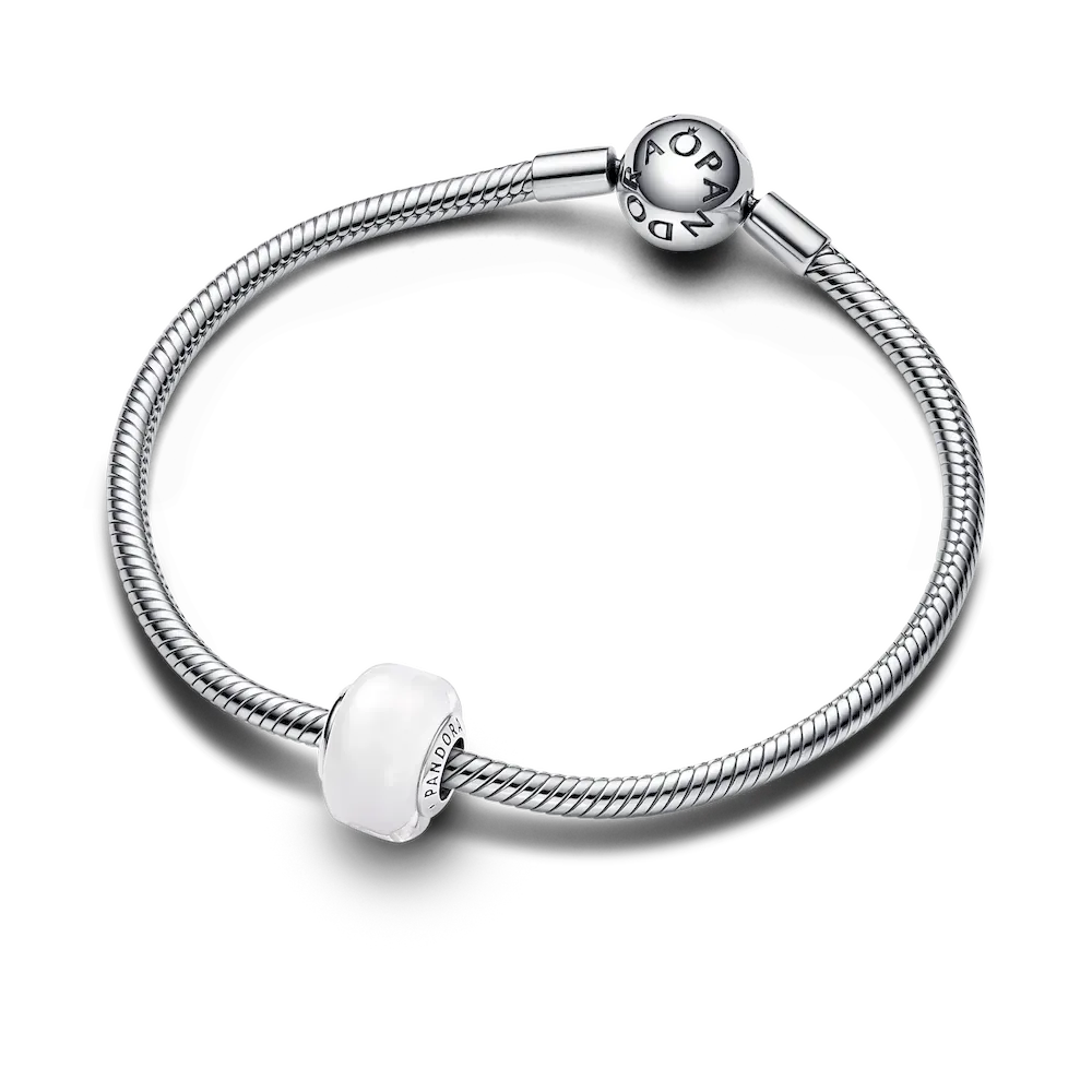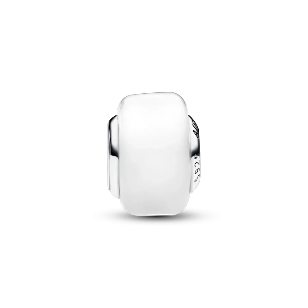 Add impact your charm styling with our White Mini Murano Glass Charm. This new charm design has a smaller size than our other Murano charms and a slightly squared shape, creating new ways to play with color and dimension in your charm line-ups. The core is made from sterling silver and fits on any Pandora Moments charm holder. Pair it with your favorite sterling silver charms or get creative and mix with the same style in other colors.